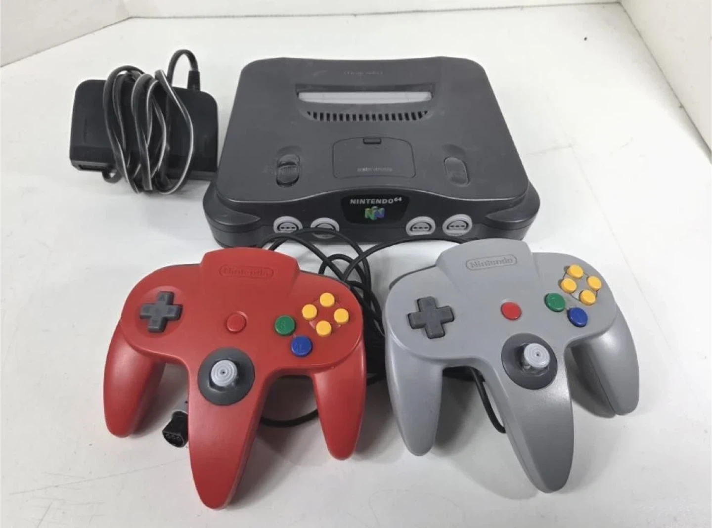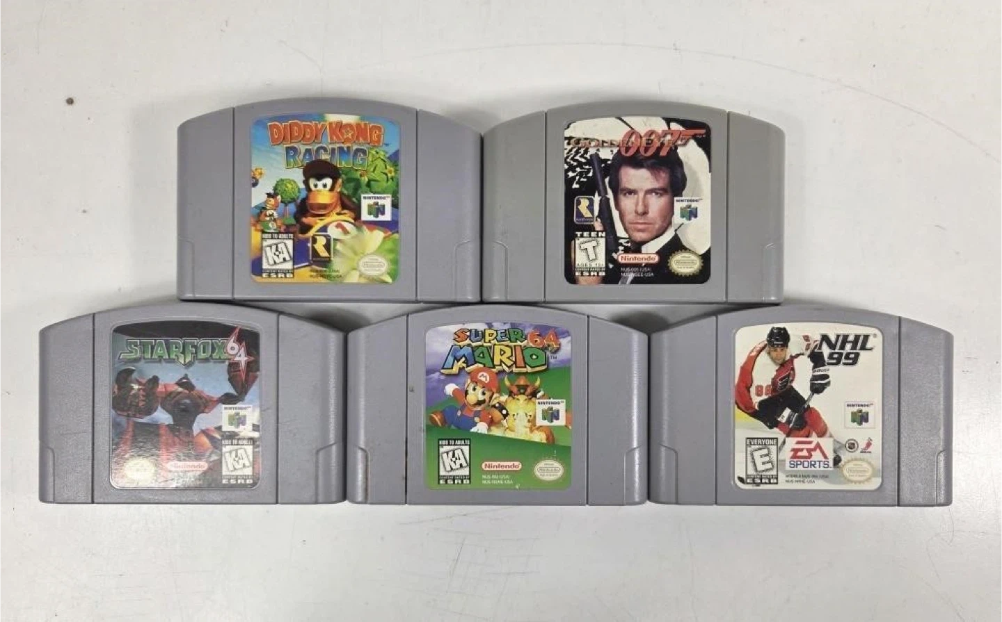 This is a Nintendo 64 console bundle. It includes the N64 system, two controllers (one red, one grey), and an AC adapter. Five game cartridges are also included: Diddy Kong Racing, 007 GoldenEye, Star Fox 64, Super Mario 64, and NHL 99. A great setup for retro gaming enthusiasts!