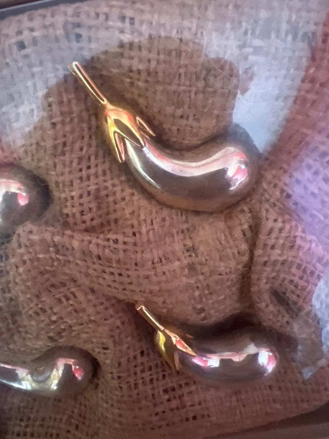 Each box includes vintage silver-plated and gold-accented eggplant-shaped knife rests. They're made of shiny silver-toned metal with gold accents. Have 4 boxes of 6. Each set $15