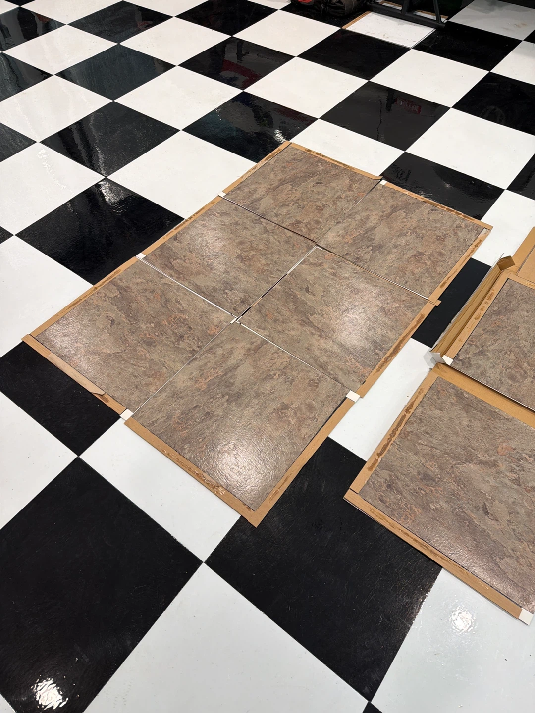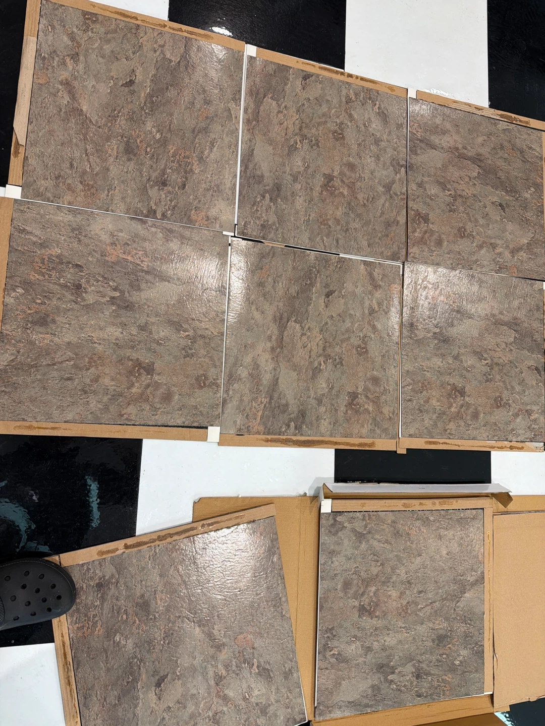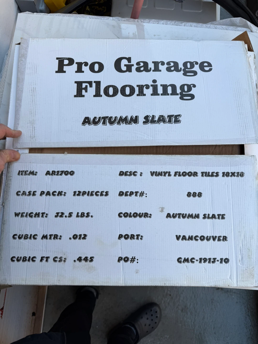 Selling 18 boxes of Pro Garage Flooring Autumn Slate vinyl floor tiles. These tiles are 18x18 inches. The colour is Autumn Slate. They come in a case pack of 12 pieces. They are in good condition and ready to be installed in your garage or workspace 18 boxes is about 480 ft.²
