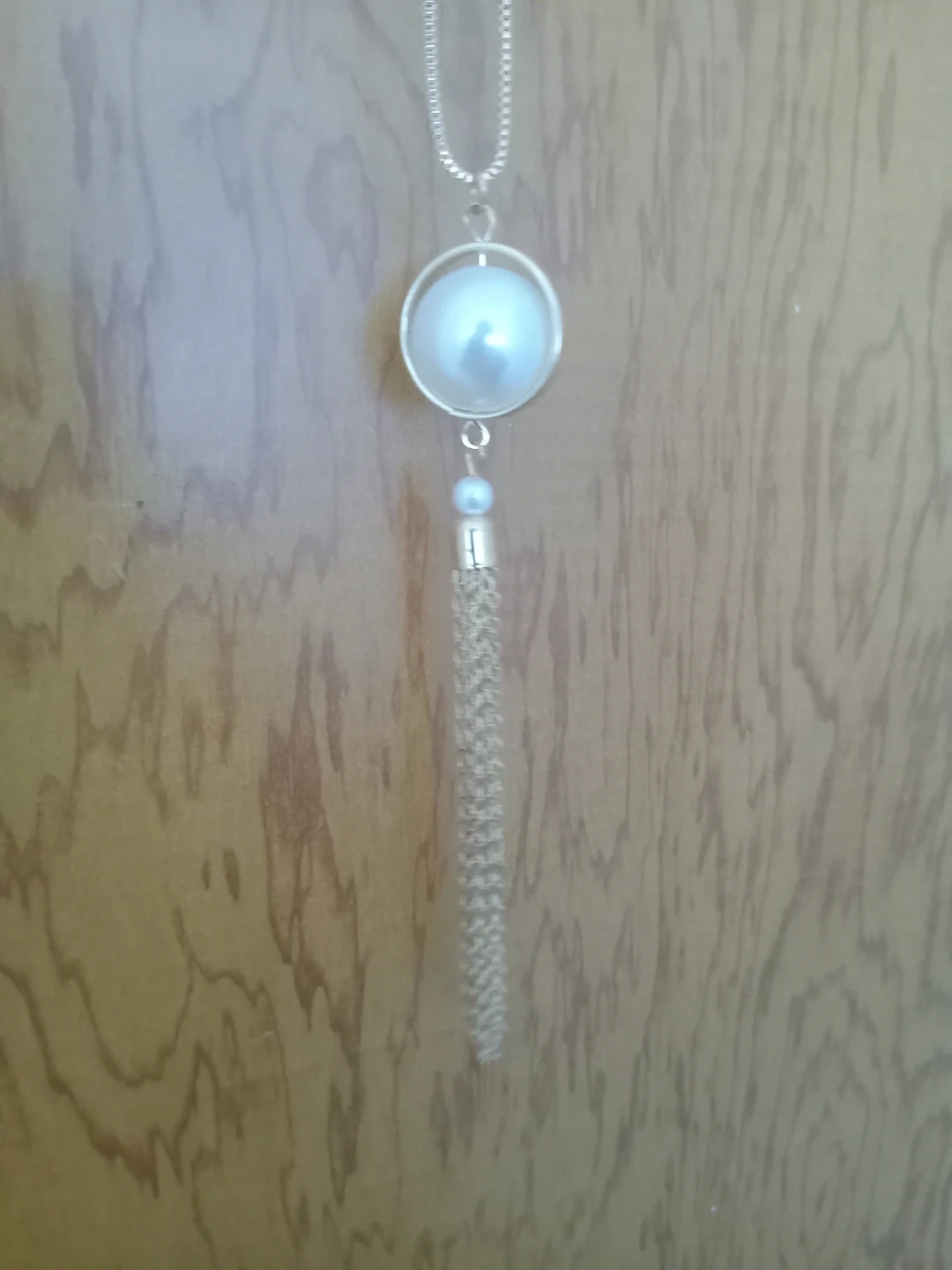 This gold-tone necklace features a large pearl pendant surrounded by a gold ring. It's accented with a smaller pearl and a delicate tassel. Chain length is adjustable.