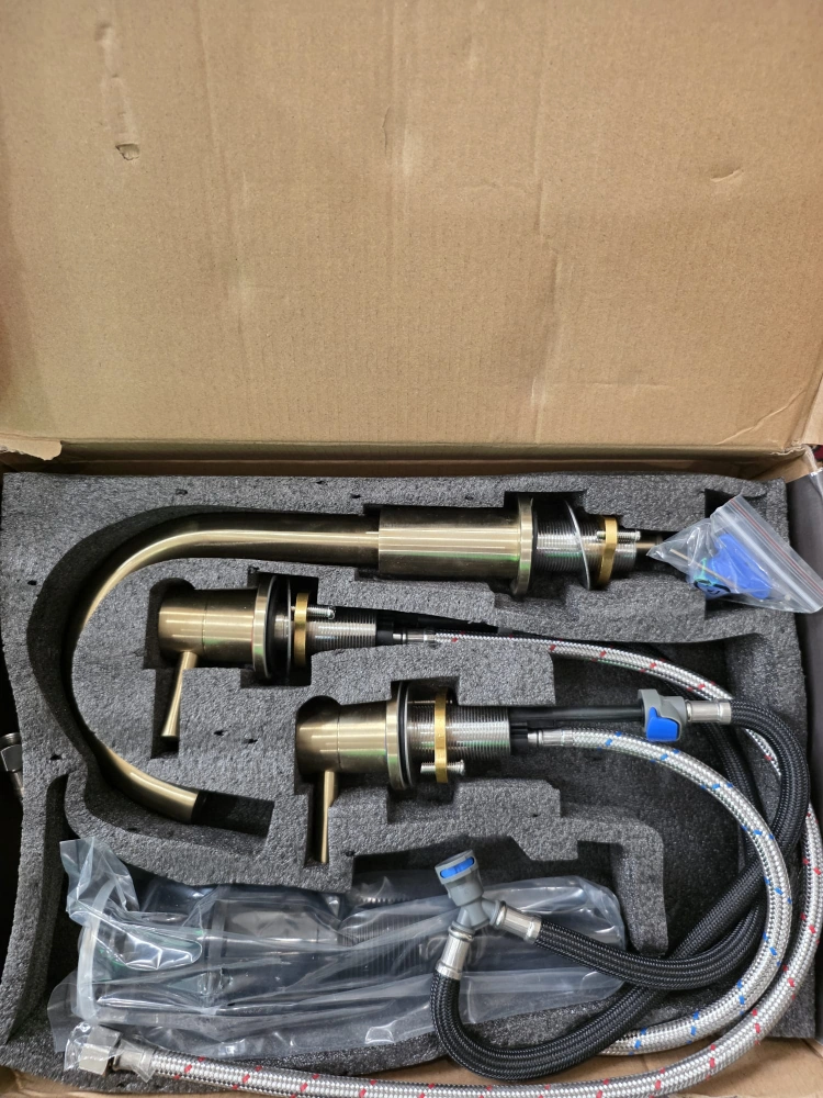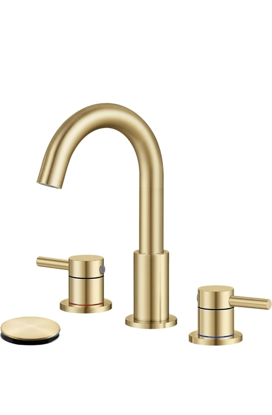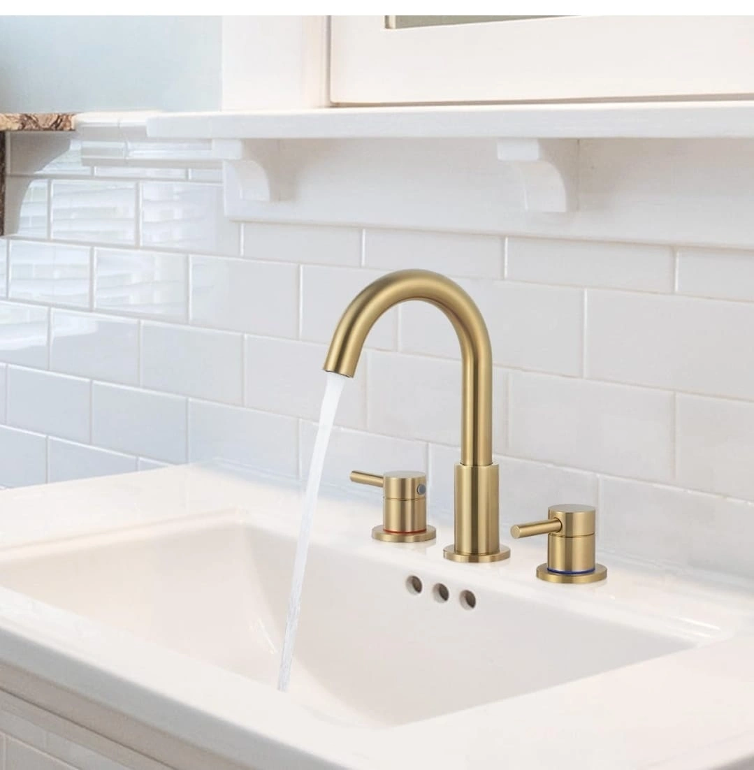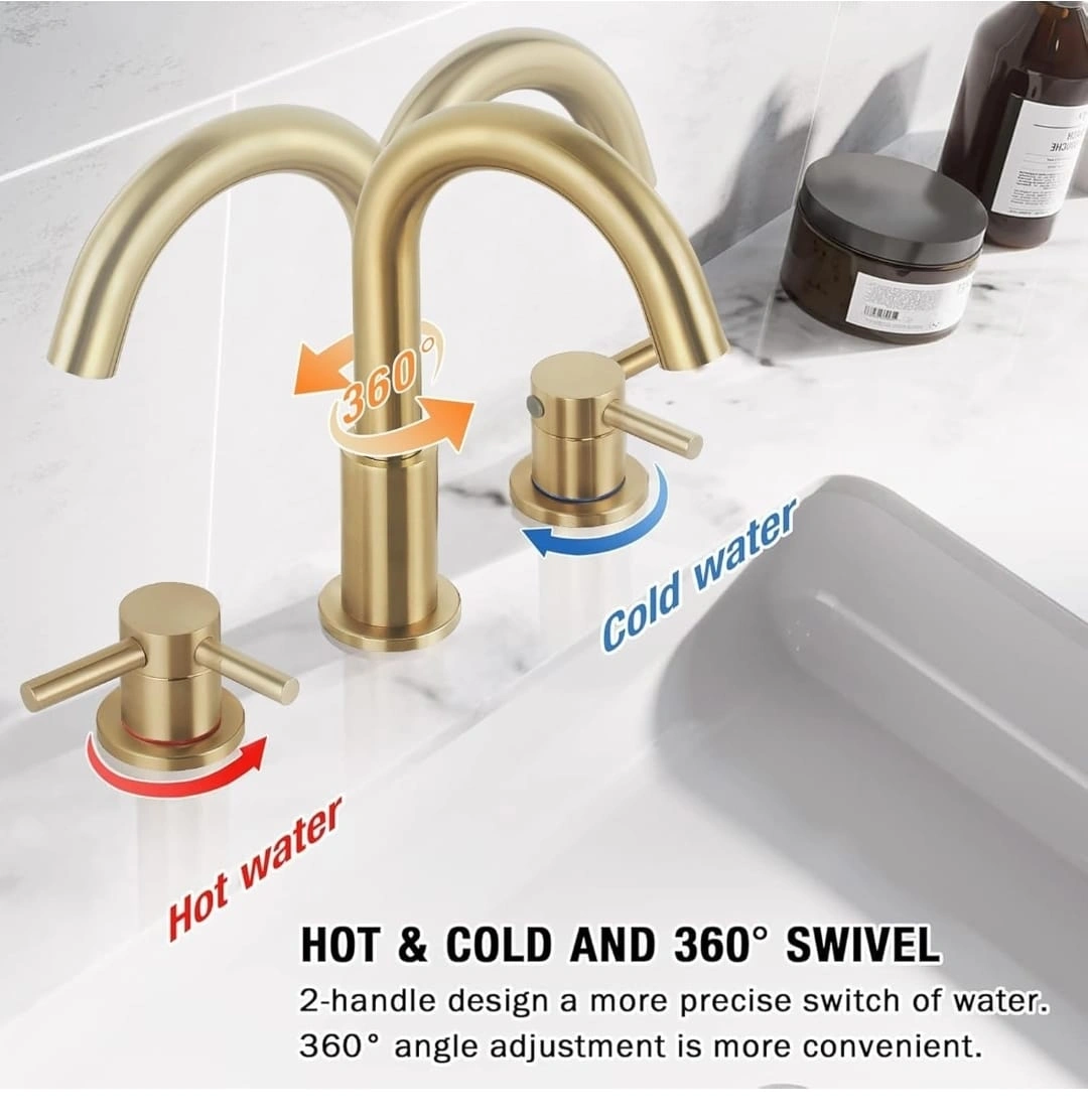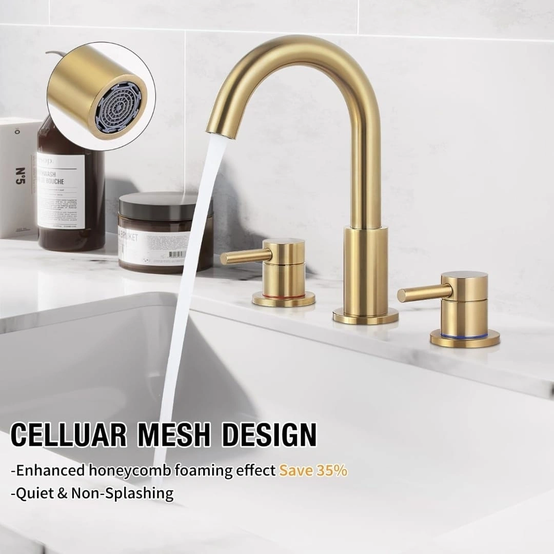 Add a touch of elegance to your bathroom with this gold faucet! It features a 2-handle design for precise water temperature control, and a 360° swivel for added convenience. The cellular mesh design ensures a quiet and non-splashing experience. Recommended width for installation is 4-16 inches
