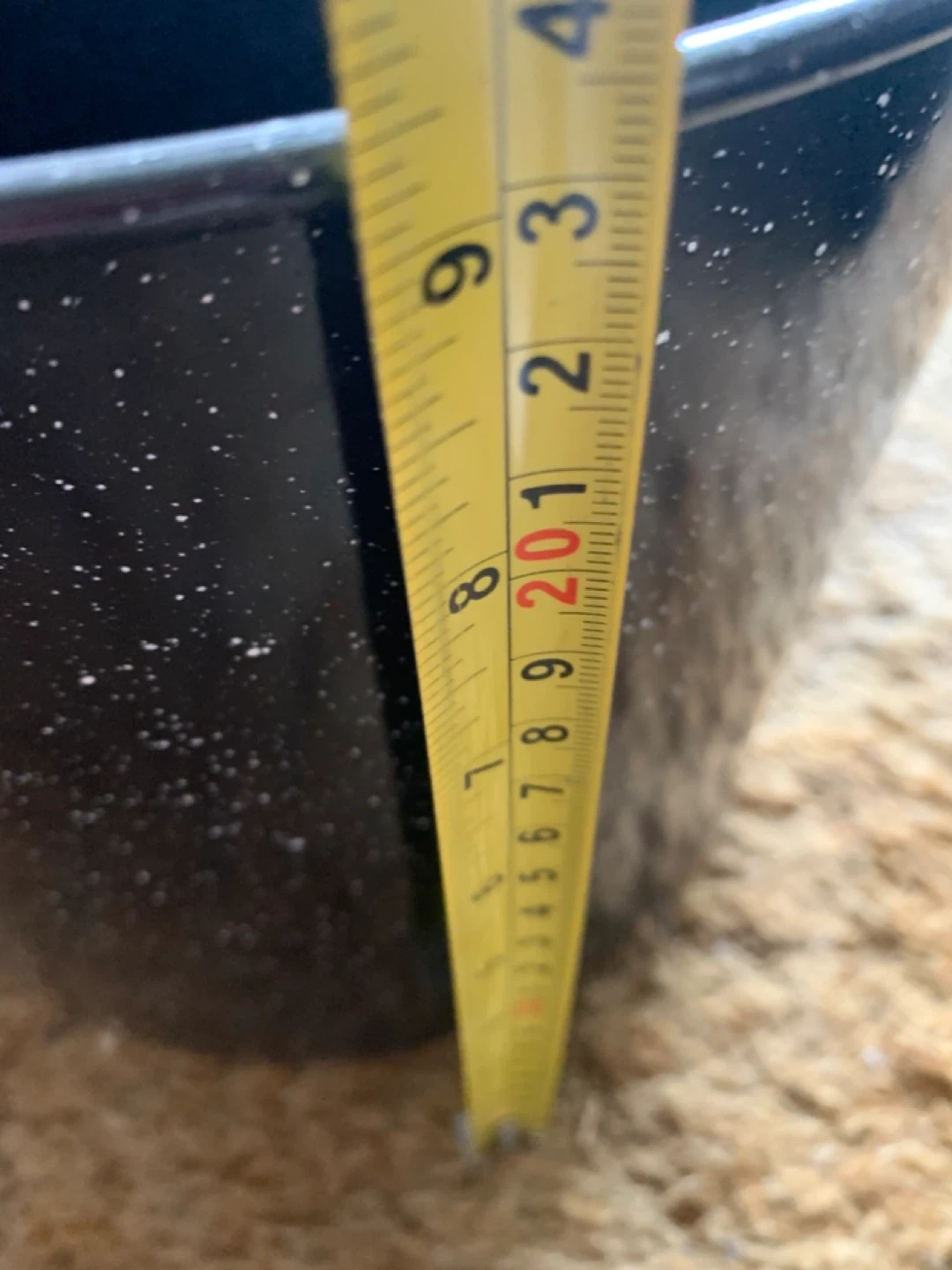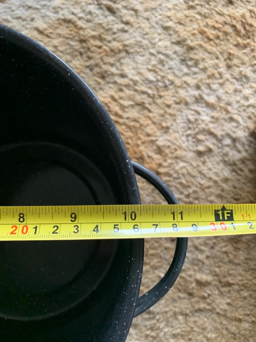 Black speckled enamel pot with a lid. It measures approximately 11 inches in diameter and 9 inches tall. This pot is made of enamel. Good for a stockpot or canning pot.