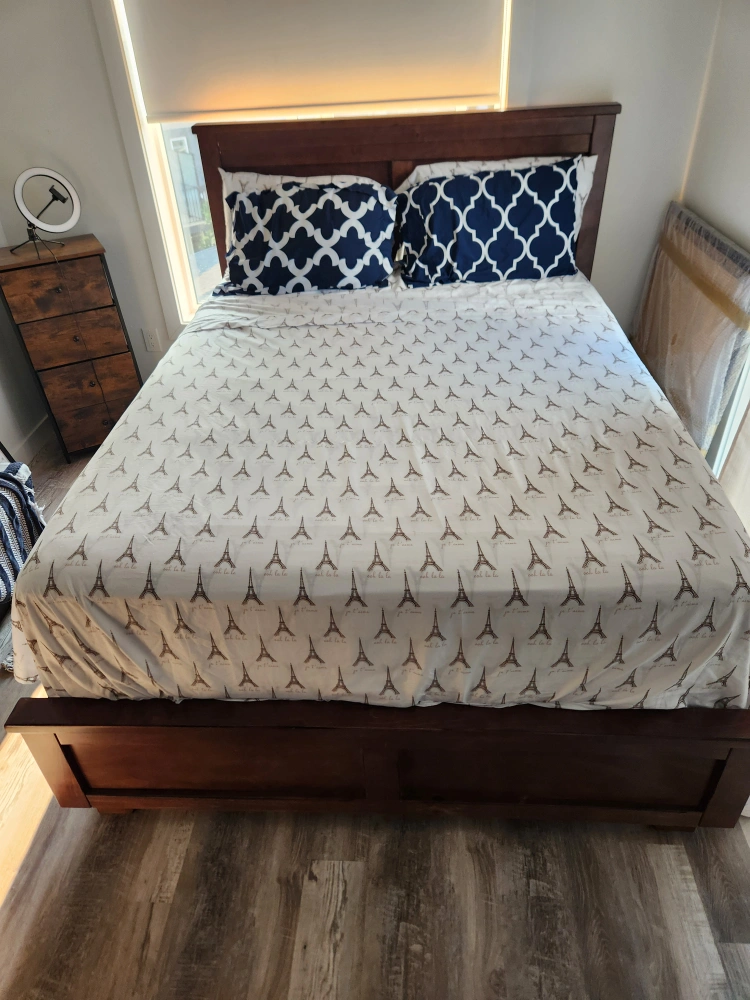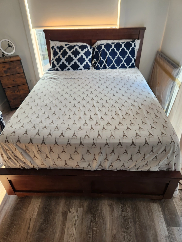 This is a queen size bed frame with head board, split box spring, and mattress. It is in excellent condition with minimal wear. It is made of solid wood and has a dark brown finish. Pick up only.