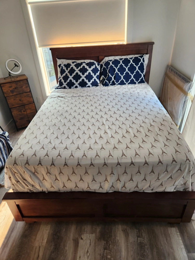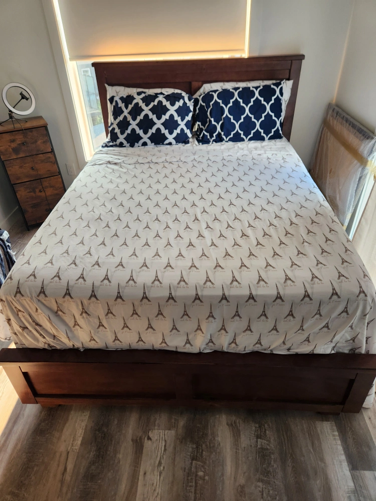 This is a queen size bed frame with head board, split box spring, and mattress. It is in excellent condition with minimal wear. It is made of solid wood and has a dark brown finish. Pick up only.