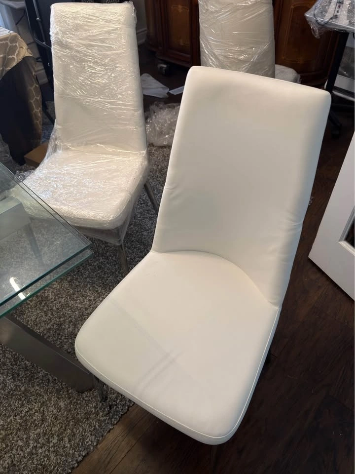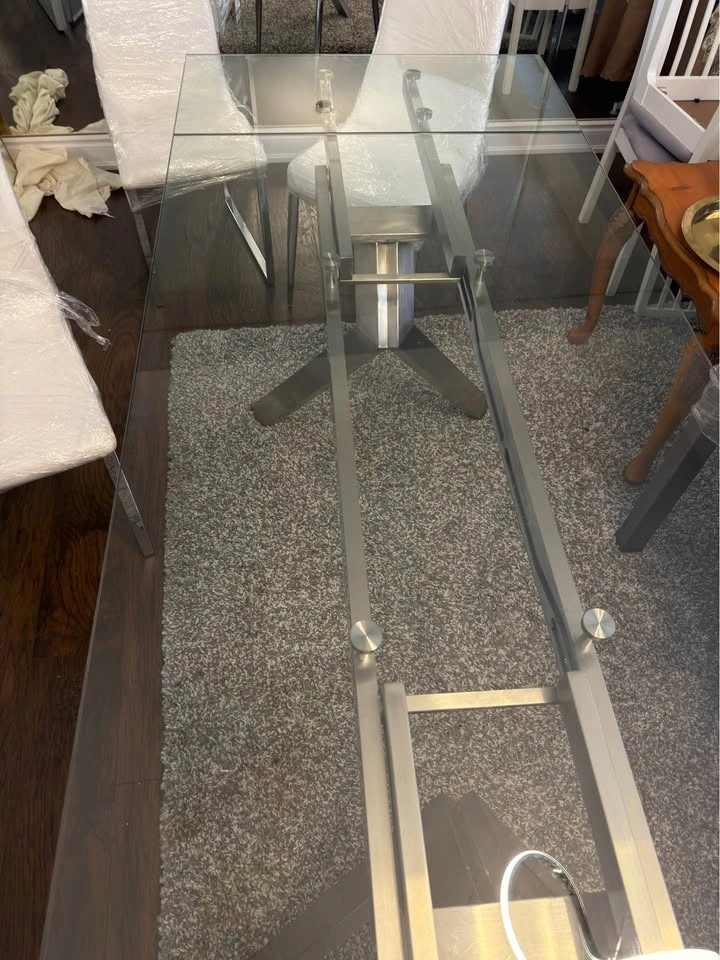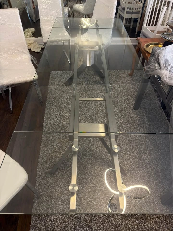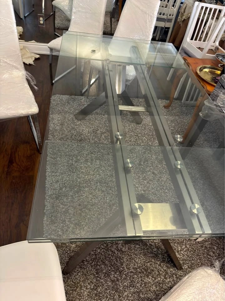 Glass expandable dining table with 6 white leather chairs (retail $1500) mint condition! Ext to 95”. LOTS of items for sale. Check out other listings. Deals for multiple items. Buy from a highly rated seller! CASH only. Pickup or can be delivered for a fee.