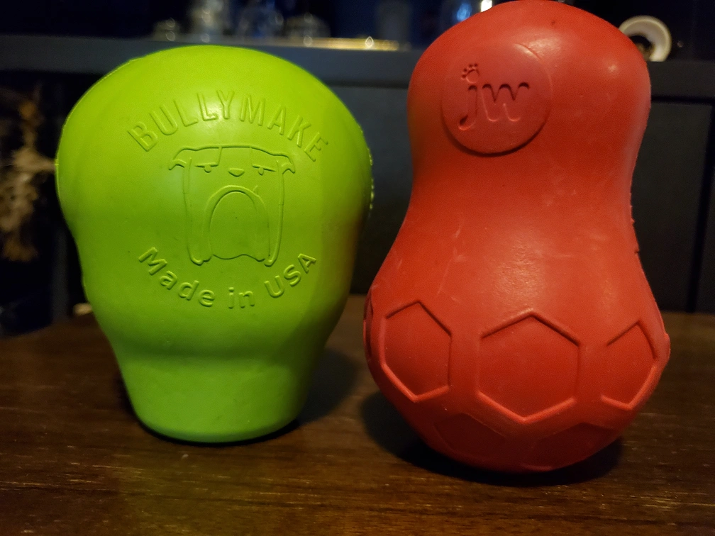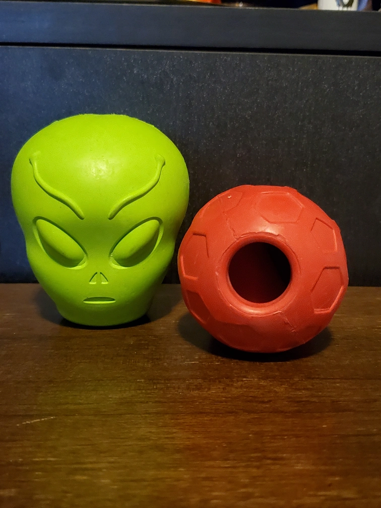 One green alien-shaped toy from Bullymake and one red honeycomb-shaped toy from JW Pet.
