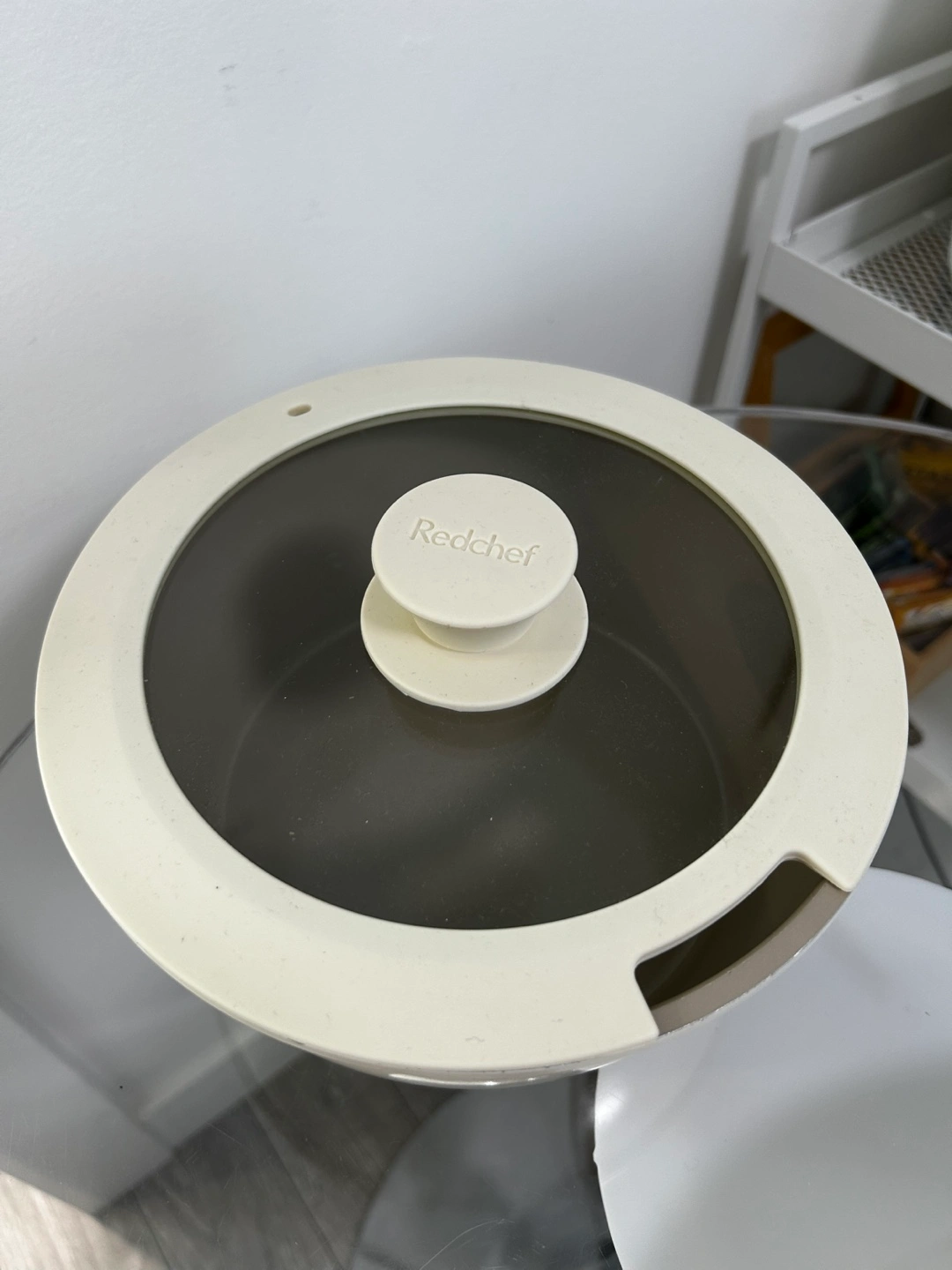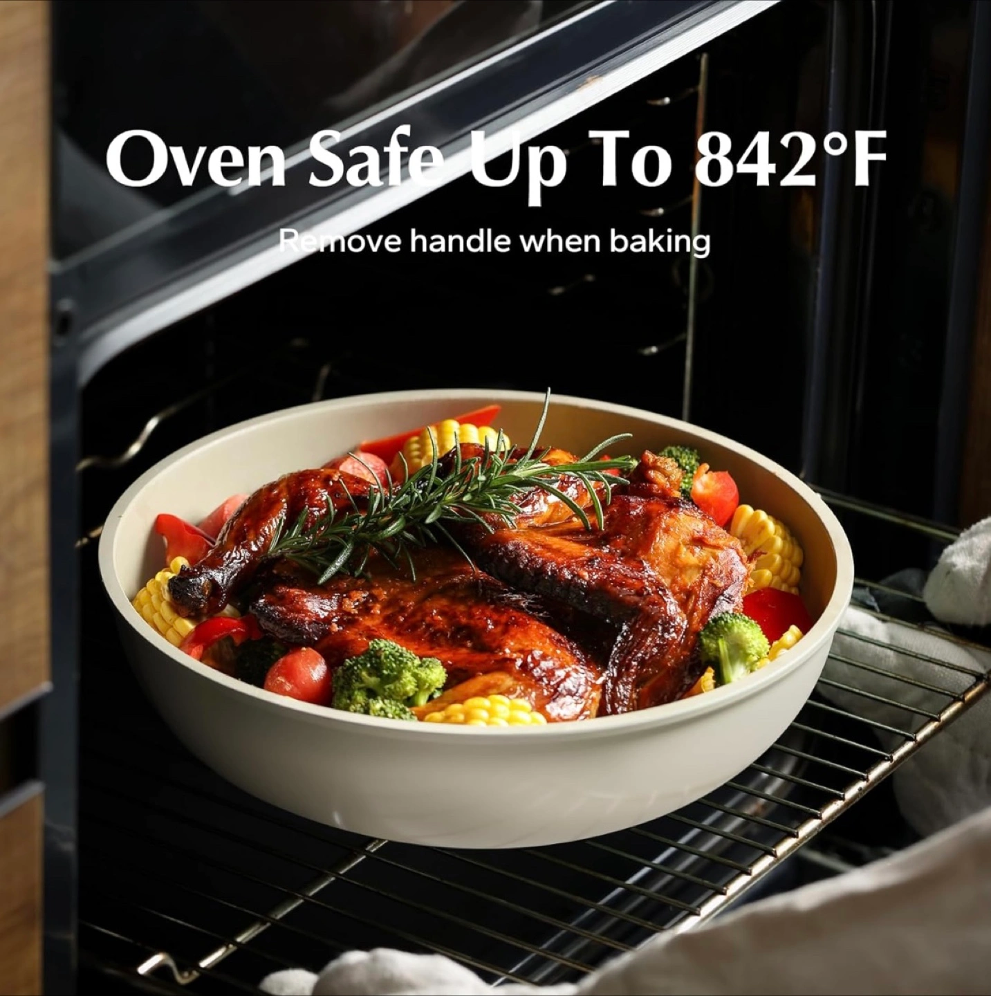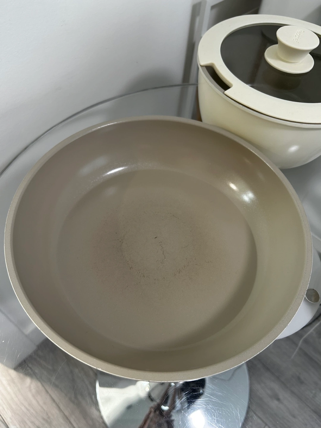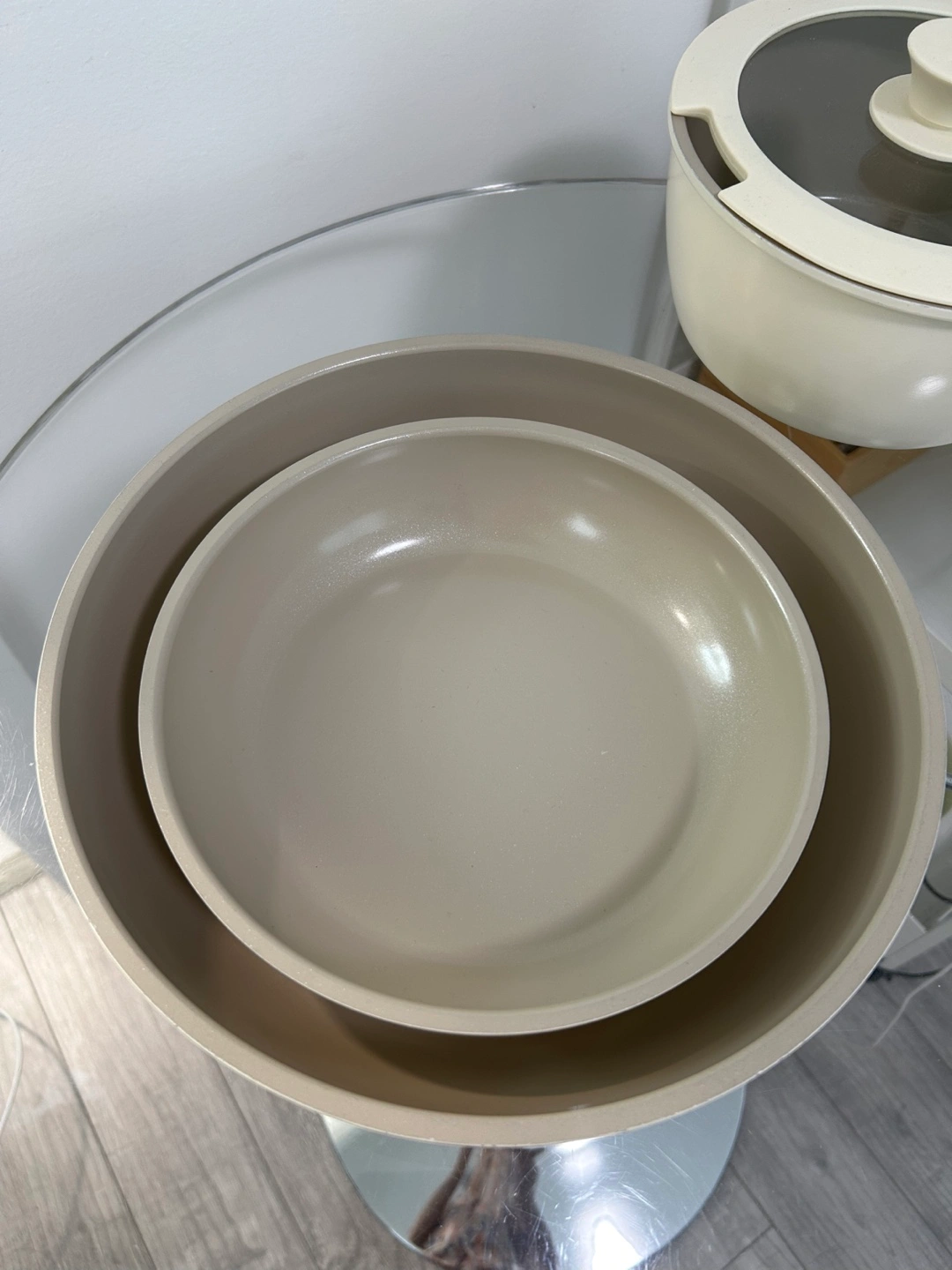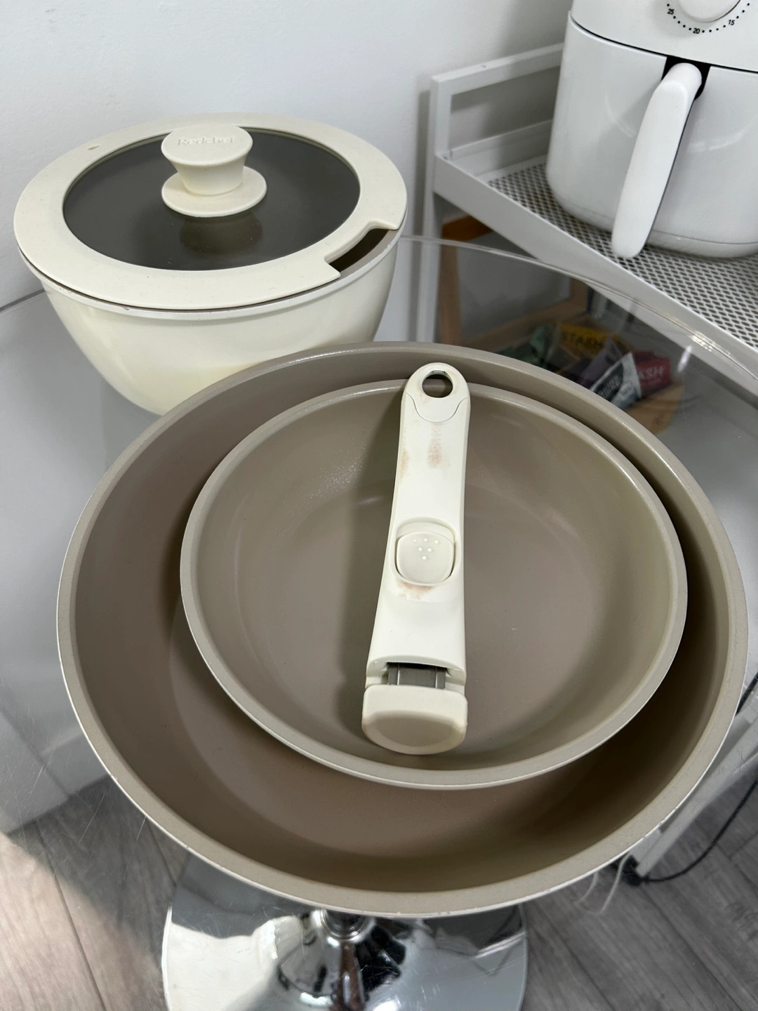 A beautiful set of off-white cookware. Includes various pans, a saucepan, and a lid. Has a detachable handle. It would be ideal to make a calming meal on a quiet night.