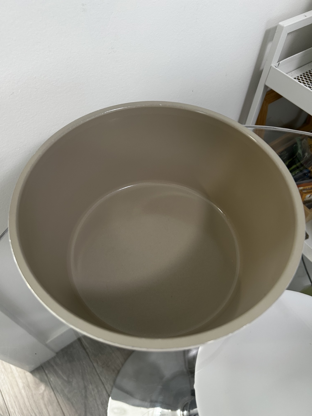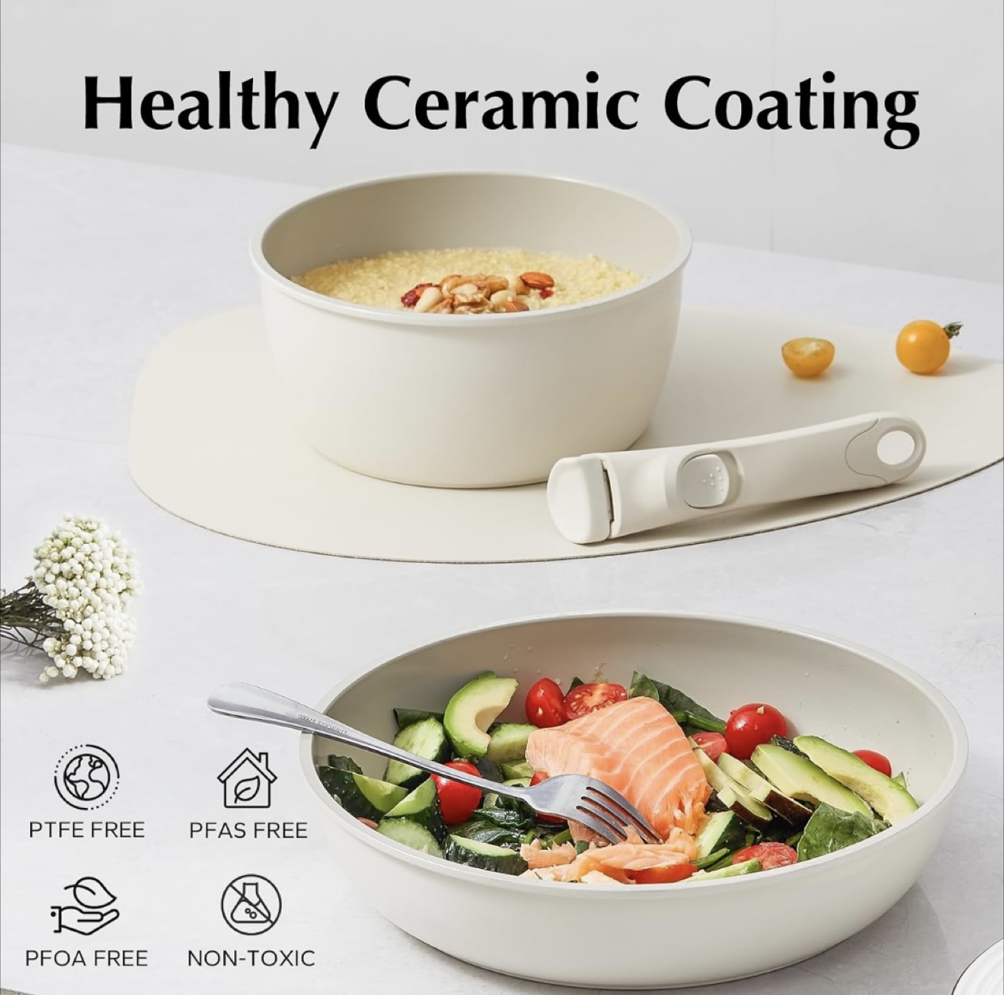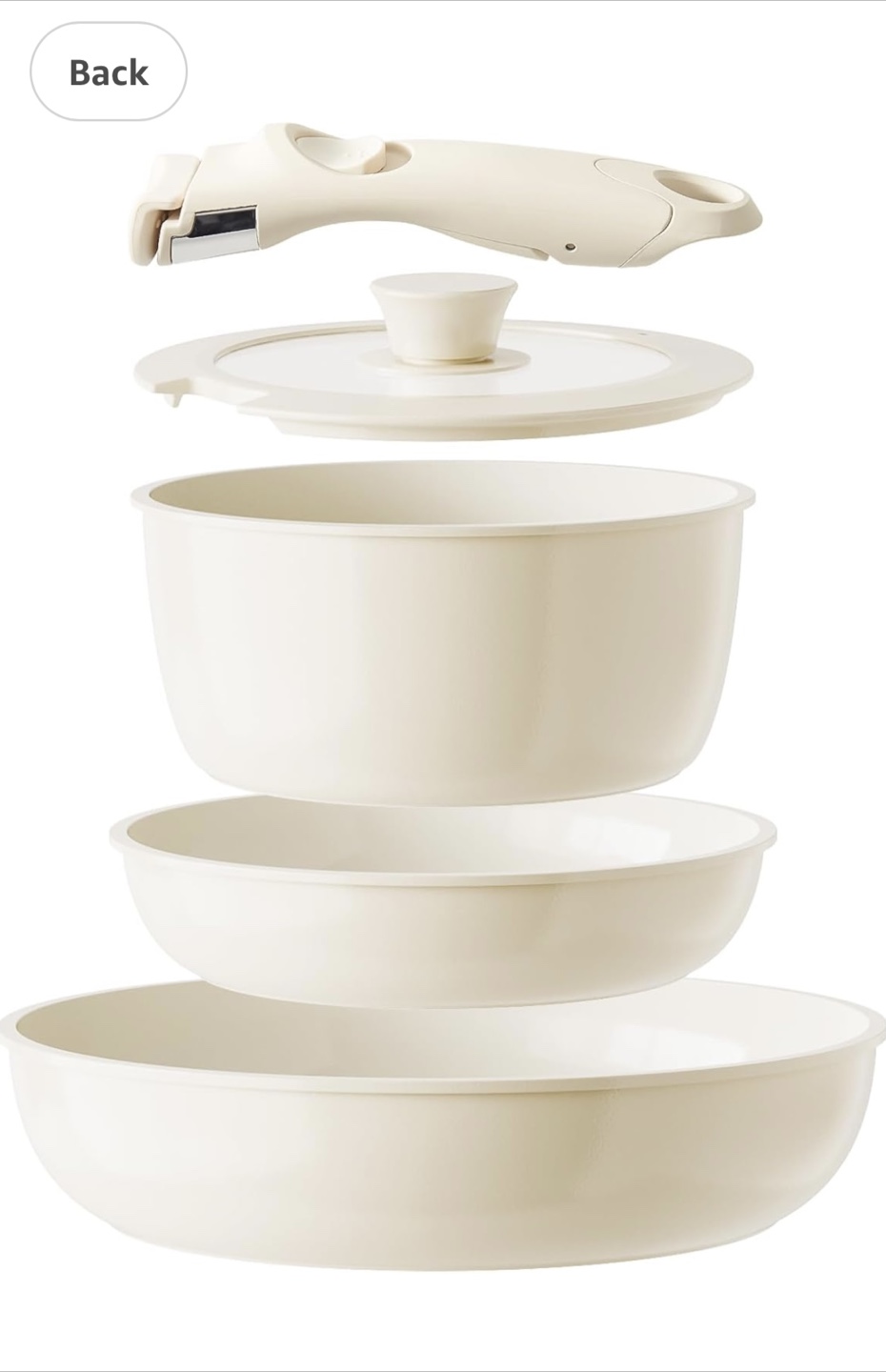 A beautiful set of off-white cookware. Includes various pans, a saucepan, and a lid. Has a detachable handle. It would be ideal to make a calming meal on a quiet night.