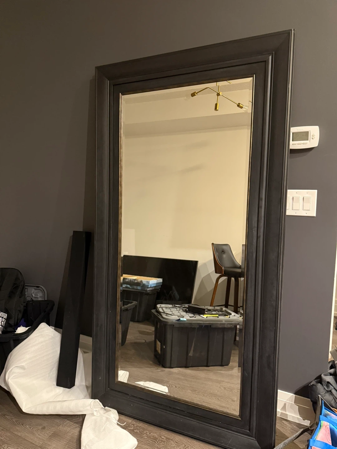 This is a large, dark grey framed mirror. It's substantial and would make a statement piece. Perfect for a hallway or bedroom!