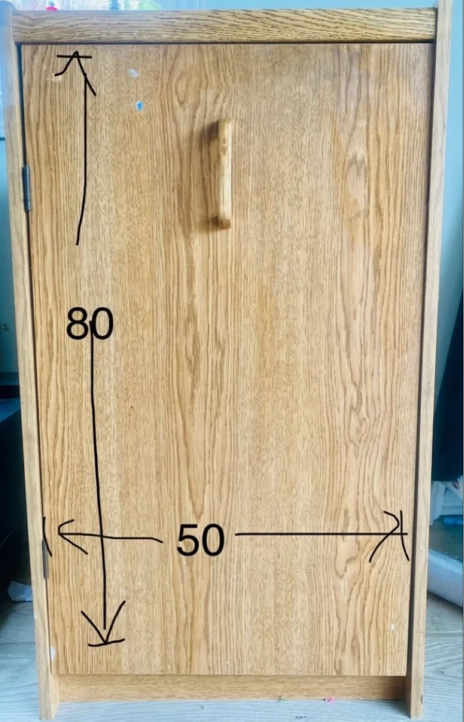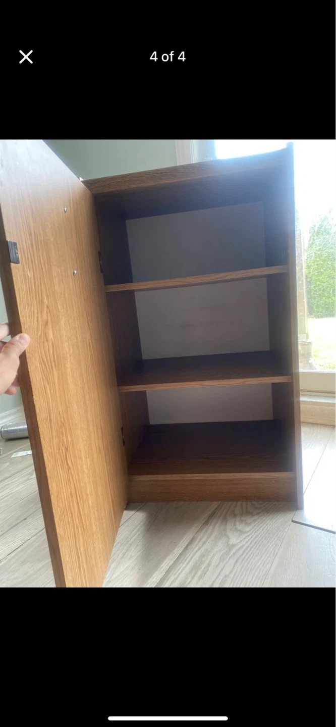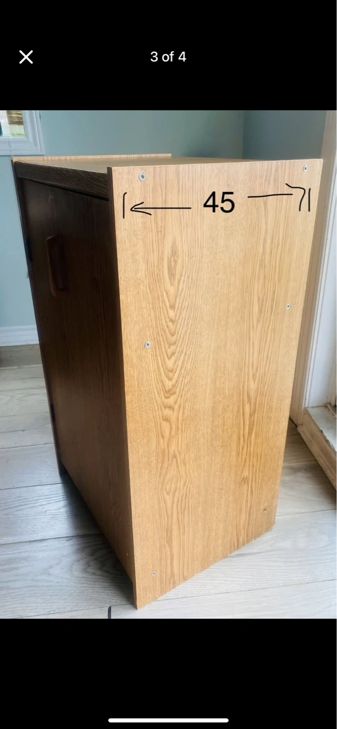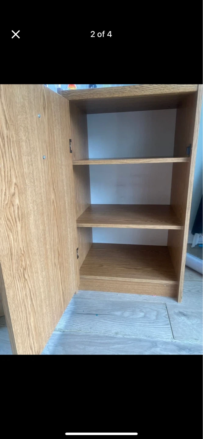 Oak-look storage cabinet with a door. Dimensions are 80cm high, 50cm wide, and 45cm deep. Good strength and is in good conditions.It's a handy piece (can be moved by one person ) for keeping things tidy! Price is CAD 25 each.