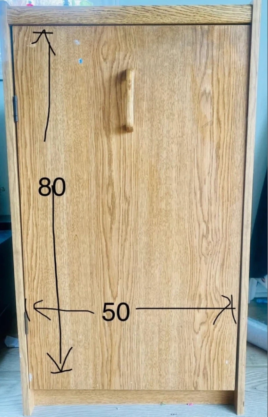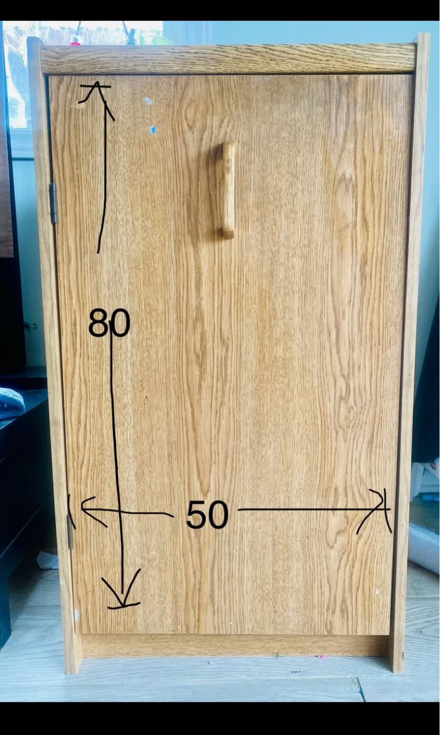 Oak-look storage cabinet with a door. Dimensions are 80cm high, 50cm wide, and 45cm deep. Good strength and is in good conditions.It's a handy piece (can be moved by one person ) for keeping things tidy! Price is CAD 25 each.