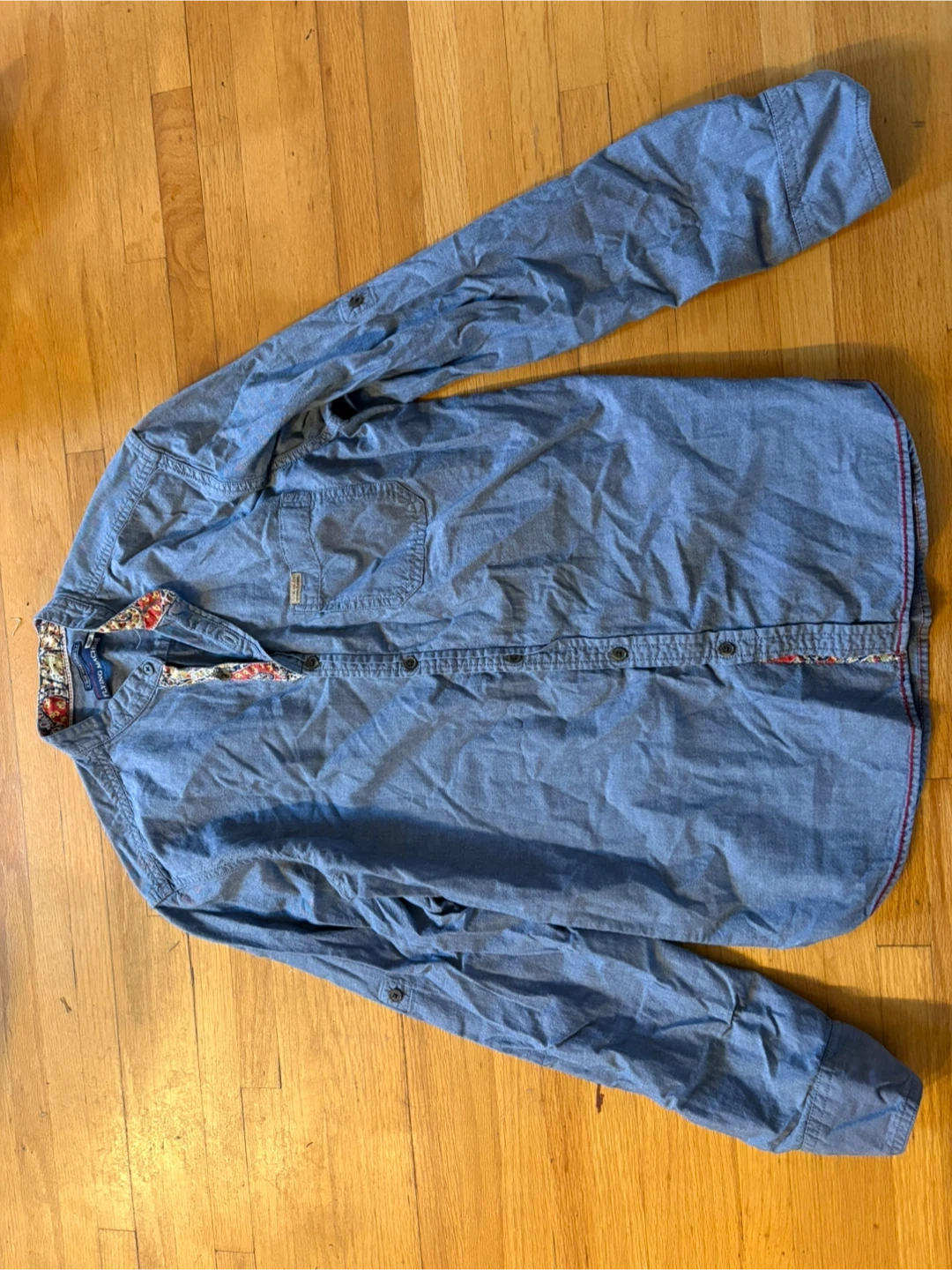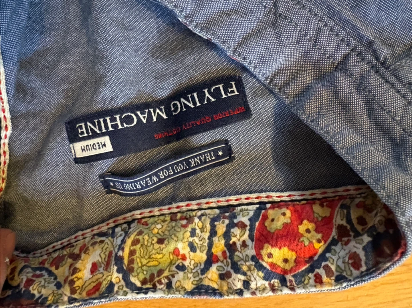 Flying Machine long-sleeve button-up shirt in a medium size. It's a classic blue chambray material with a patterned trim on the collar and cuffs. This shirt's classic cut makes it suitable for casual wear.