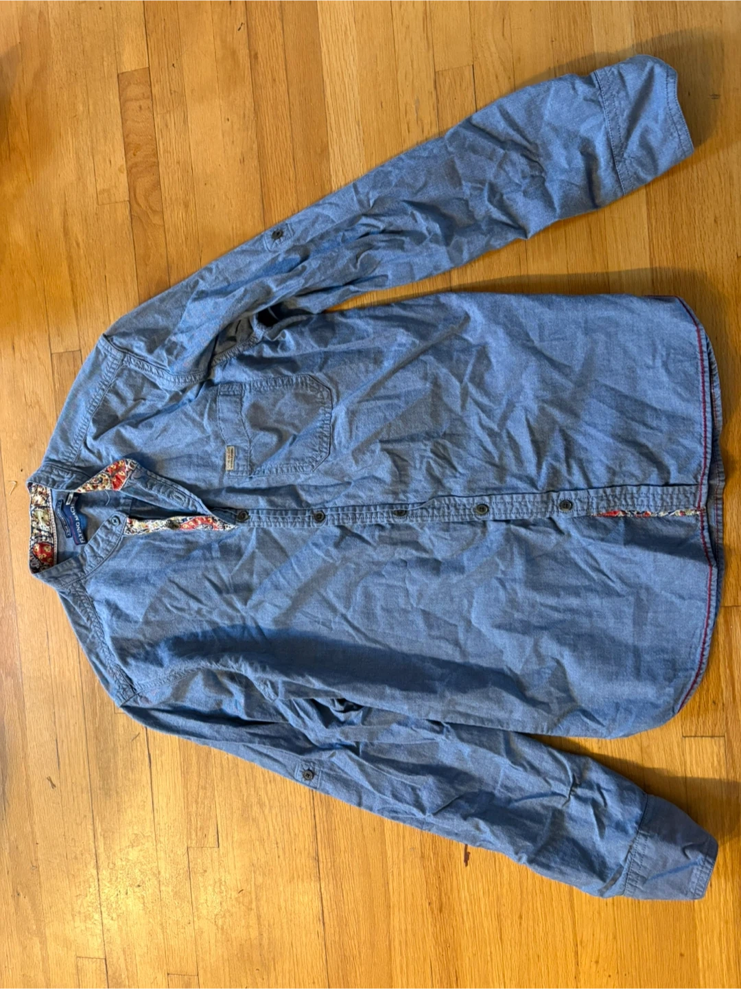 Flying Machine long-sleeve button-up shirt in a medium size. It's a classic blue chambray material with a patterned trim on the collar and cuffs. This shirt's classic cut makes it suitable for casual wear.