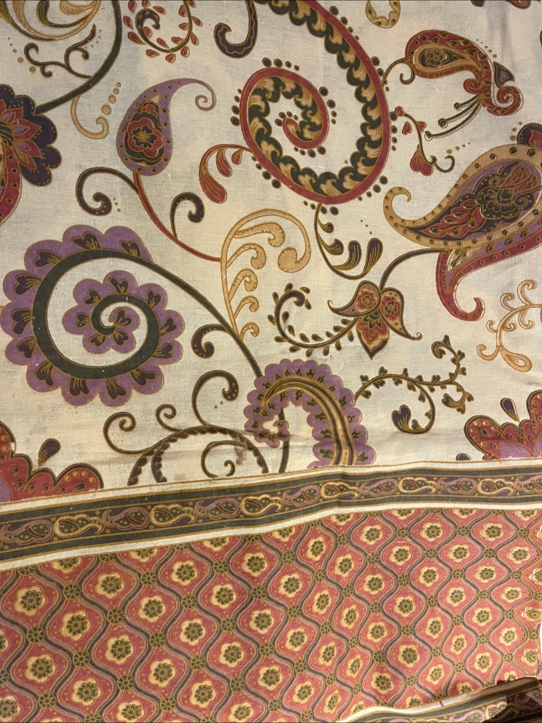 Here's a cotton fabric. It features a mix of floral and paisley designs in colours like purple, brown, and beige. It could be great table cloth