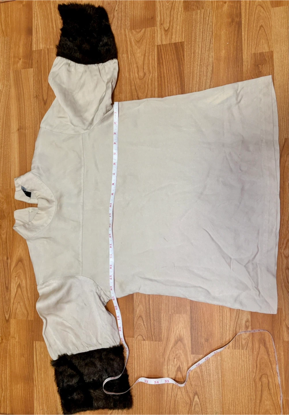 Design: A taupe or cream-colored blouse with distinctive oversized brown faux fur cuffs and 3/4-length sleeves.