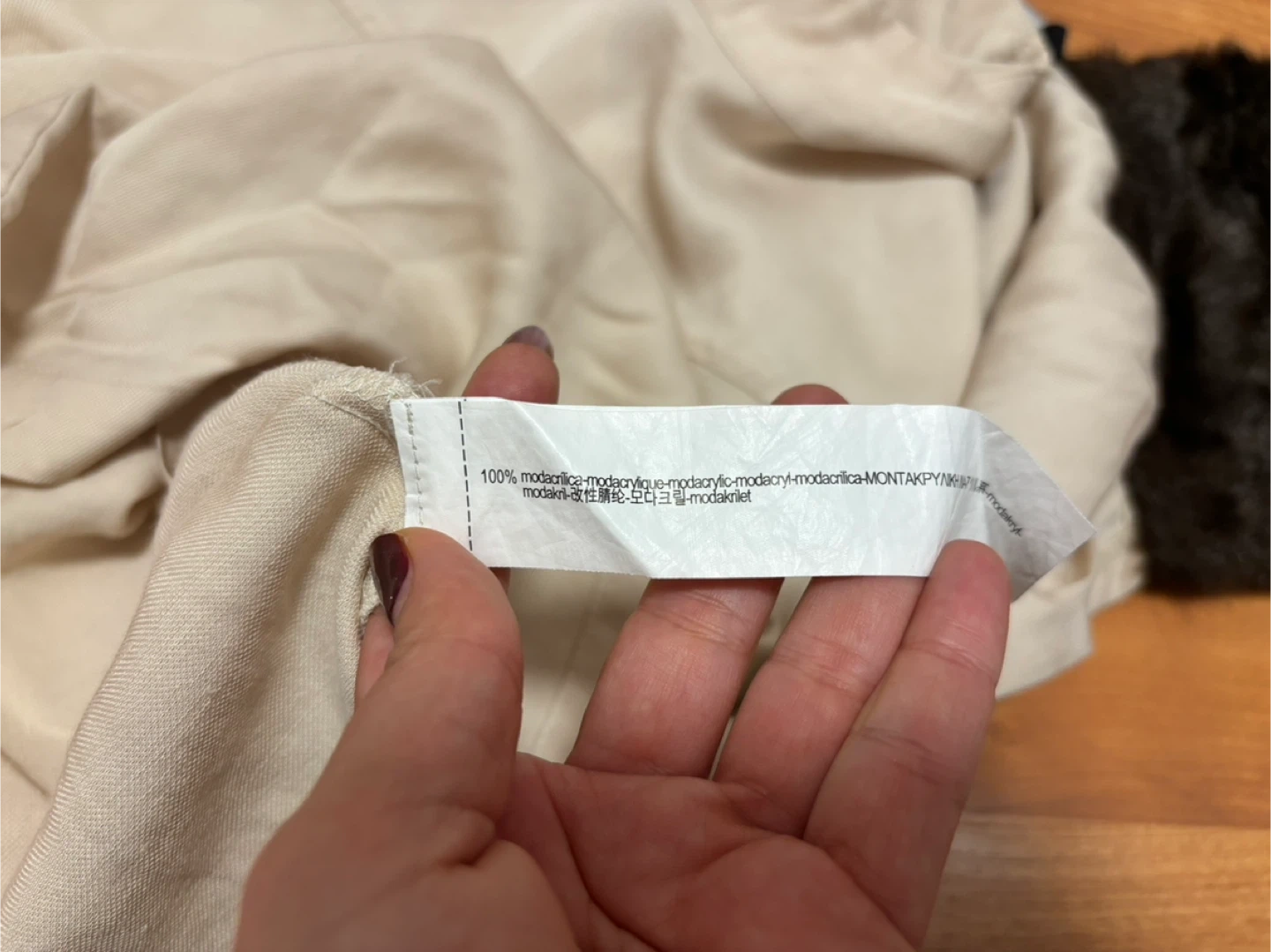 Materials: The body is generally a blend of viscose and linen, while the cuffs are made of 100% modacrylic faux fur.