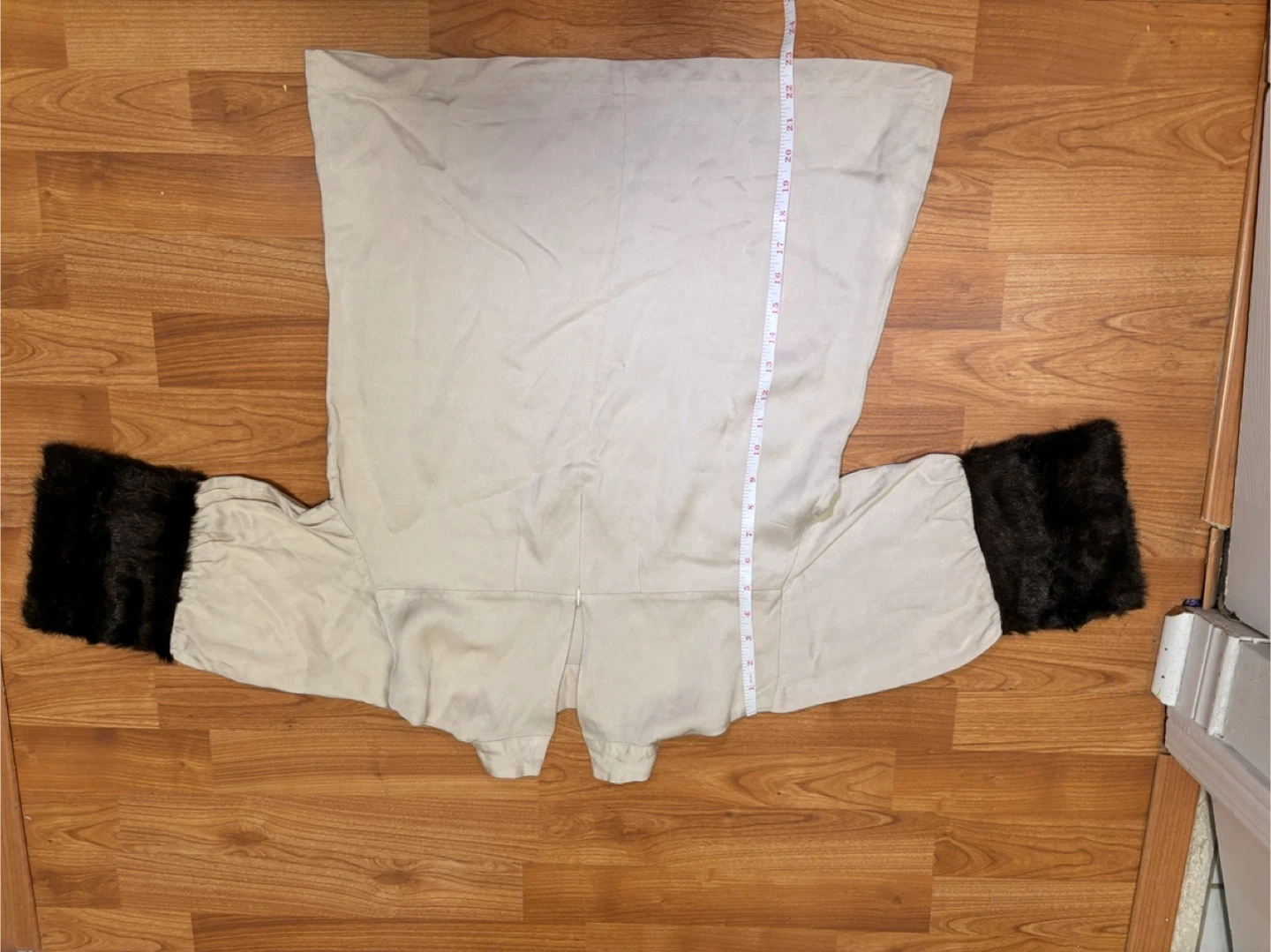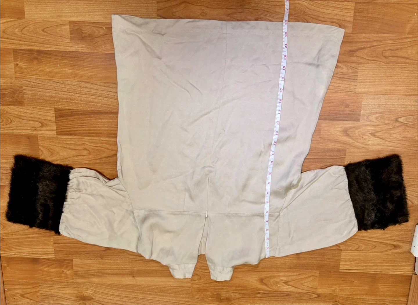 Design: A taupe or cream-colored blouse with distinctive oversized brown faux fur cuffs and 3/4-length sleeves.