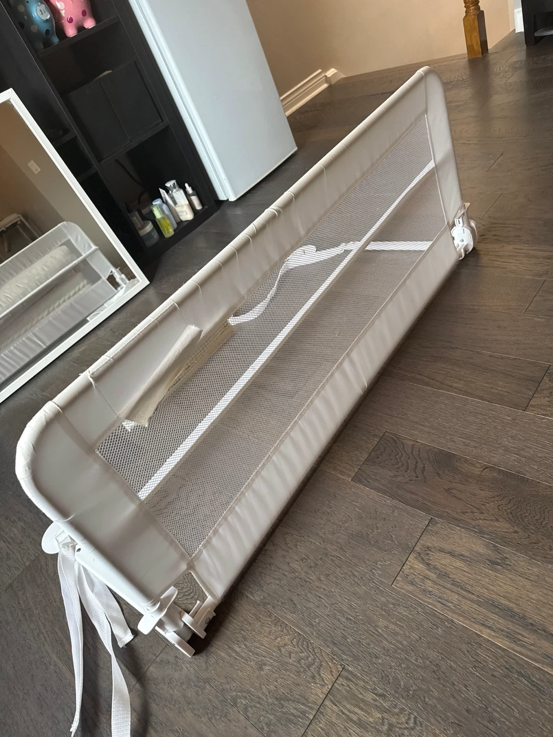 This bed rail guard is designed to prevent little ones from rolling out of bed. It features a mesh panel for visibility and has fabric straps for securing it to the mattress. White fabric with a white mesh insert. Suitable for toddler beds.