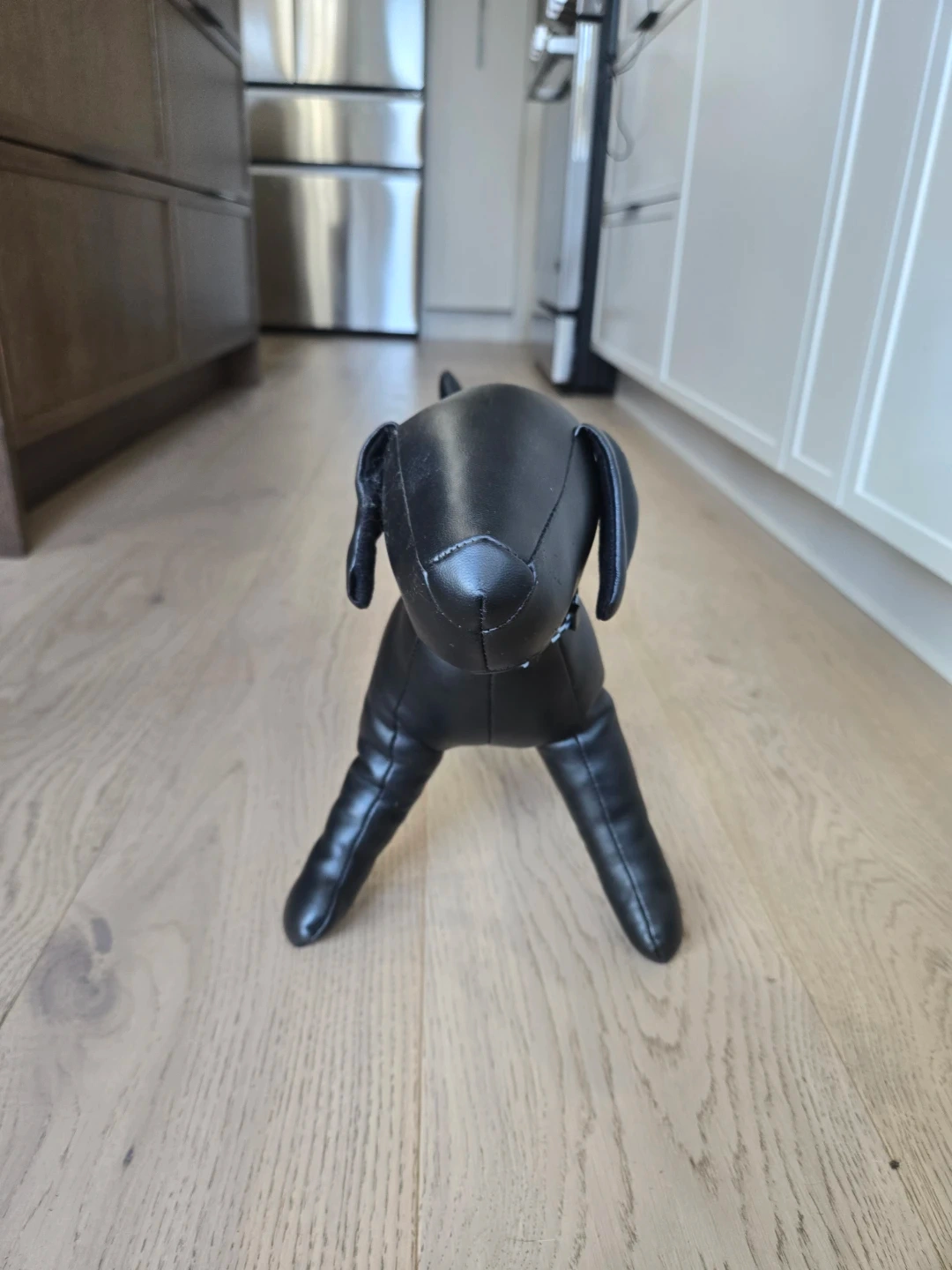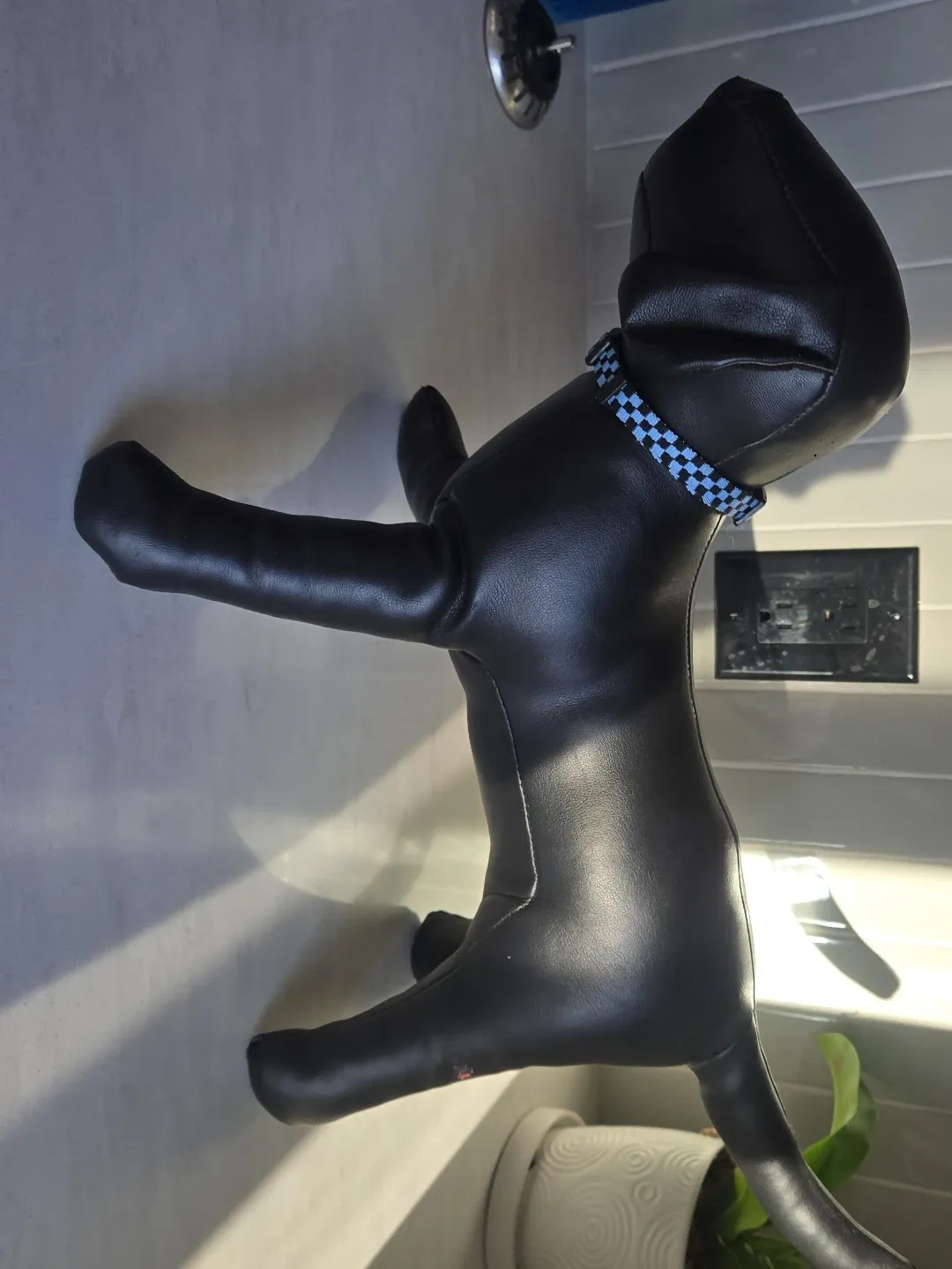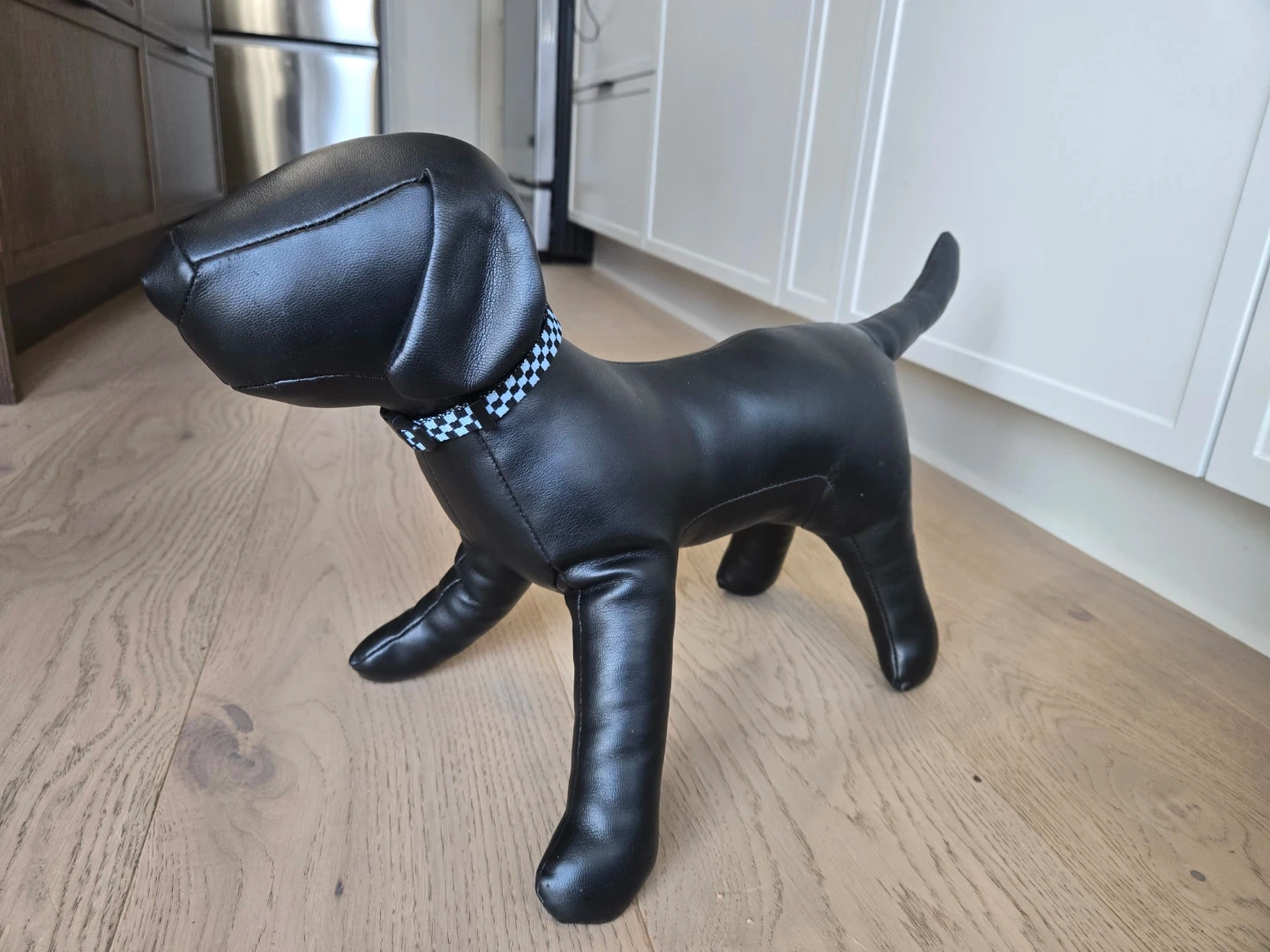 This is a black faux leather doorstop. It has a blue and white checkered collar and it's a fun Doorstop or cute decorative piece for any room.