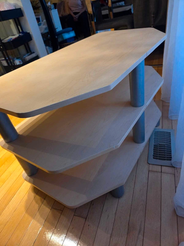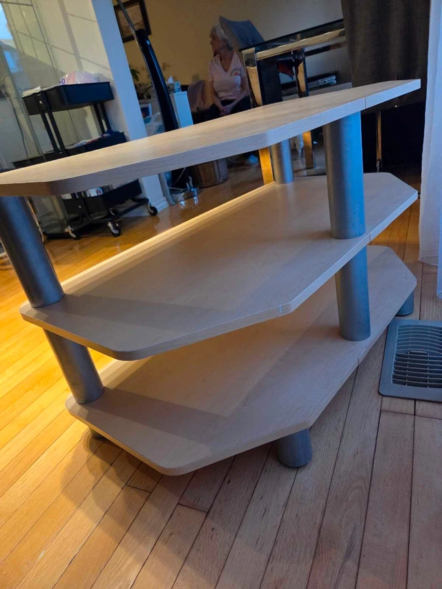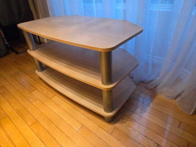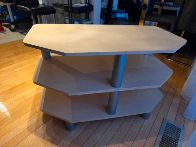 This is a stylish TV stand with a modern look. It features three shelves, perfect for holding your media devices and accessories. It's sturdy and in good condition, ready to add a touch of elegance to your living room. Three-tier shelving. Sturdy construction. Modern design. Dimensions: 19.5" x 36" and 20.75" tall. Let me know if you're interested!