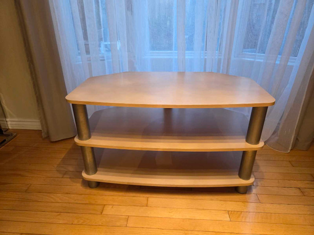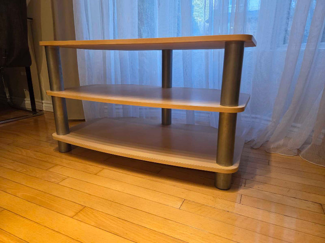 This is a stylish TV stand with a modern look. It features three shelves, perfect for holding your media devices and accessories. It's sturdy and in good condition, ready to add a touch of elegance to your living room. Three-tier shelving. Sturdy construction. Modern design. Dimensions: 19.5" x 36" and 20.75" tall. Let me know if you're interested!