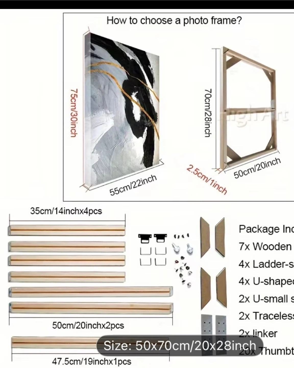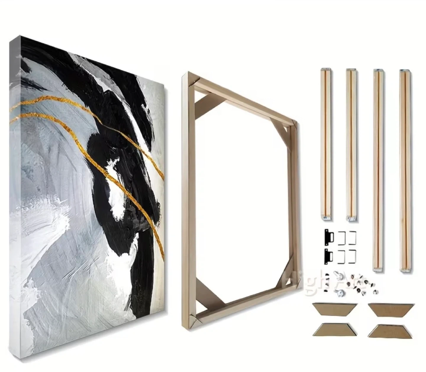 This is a solid wood frame kit for stretching your canvas art. It includes all the necessary wooden pieces and hardware for assembly. The frame is designed for a 50x70cm canvas.