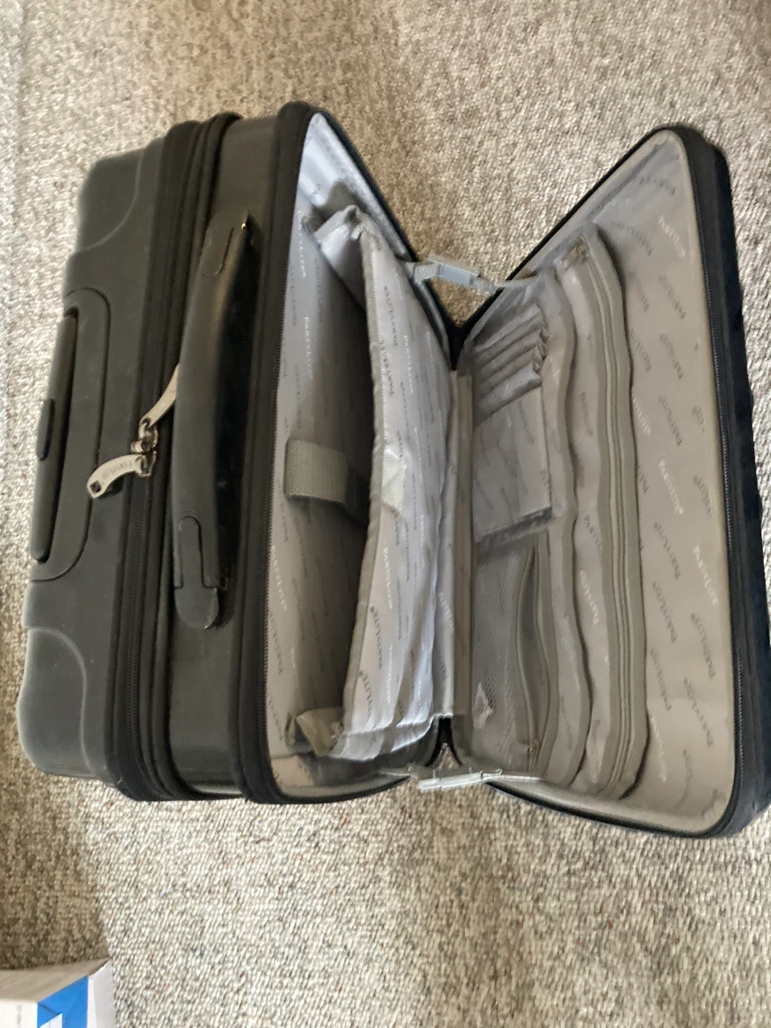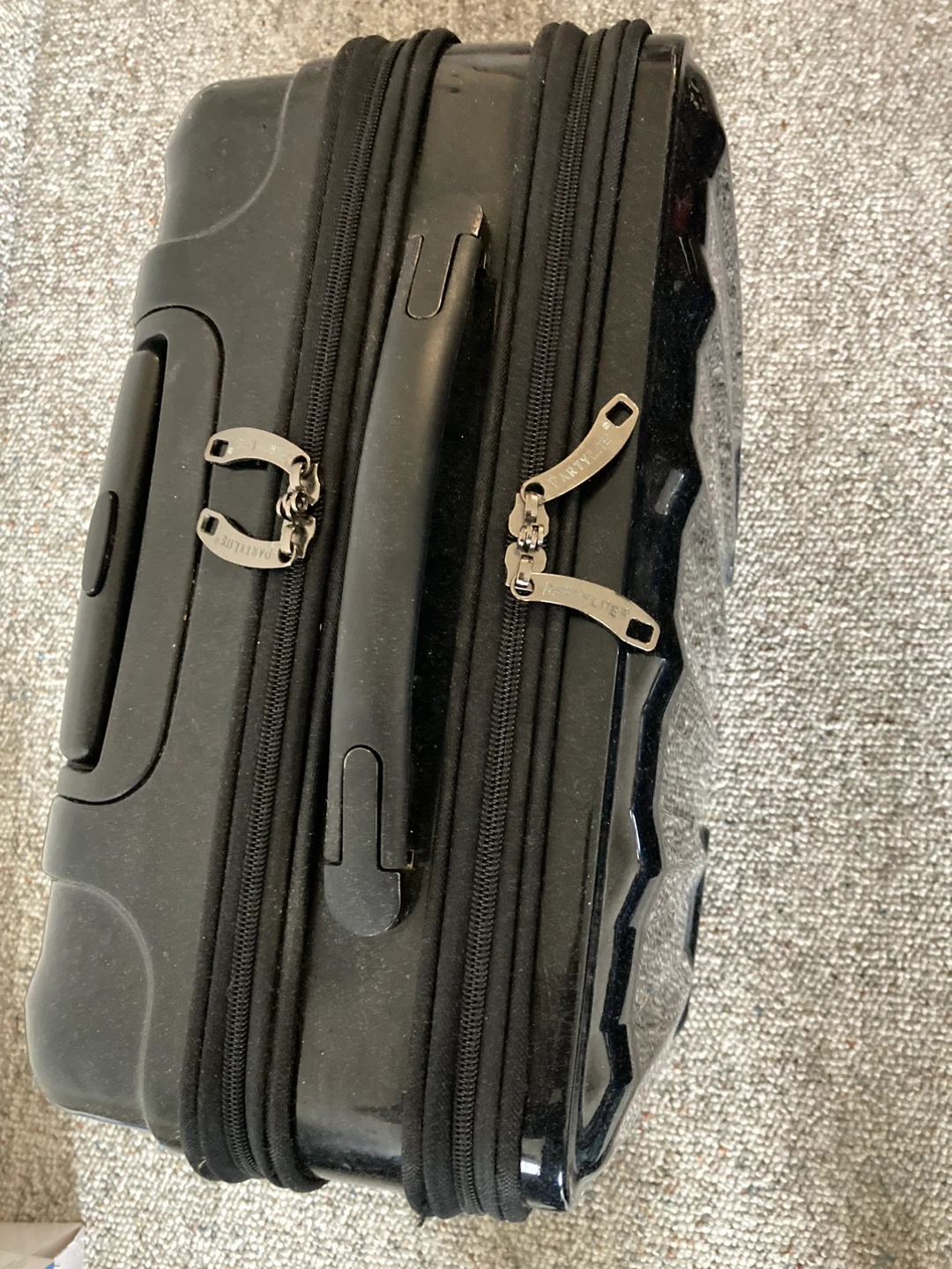 Black hard-shell carry-on suitcase. Features a spacious interior with multiple zippered compartments and organizational pockets. Telescoping handle and spinner wheels for easy transport. Exterior dimensions are approximately 21" x 14" x 9".