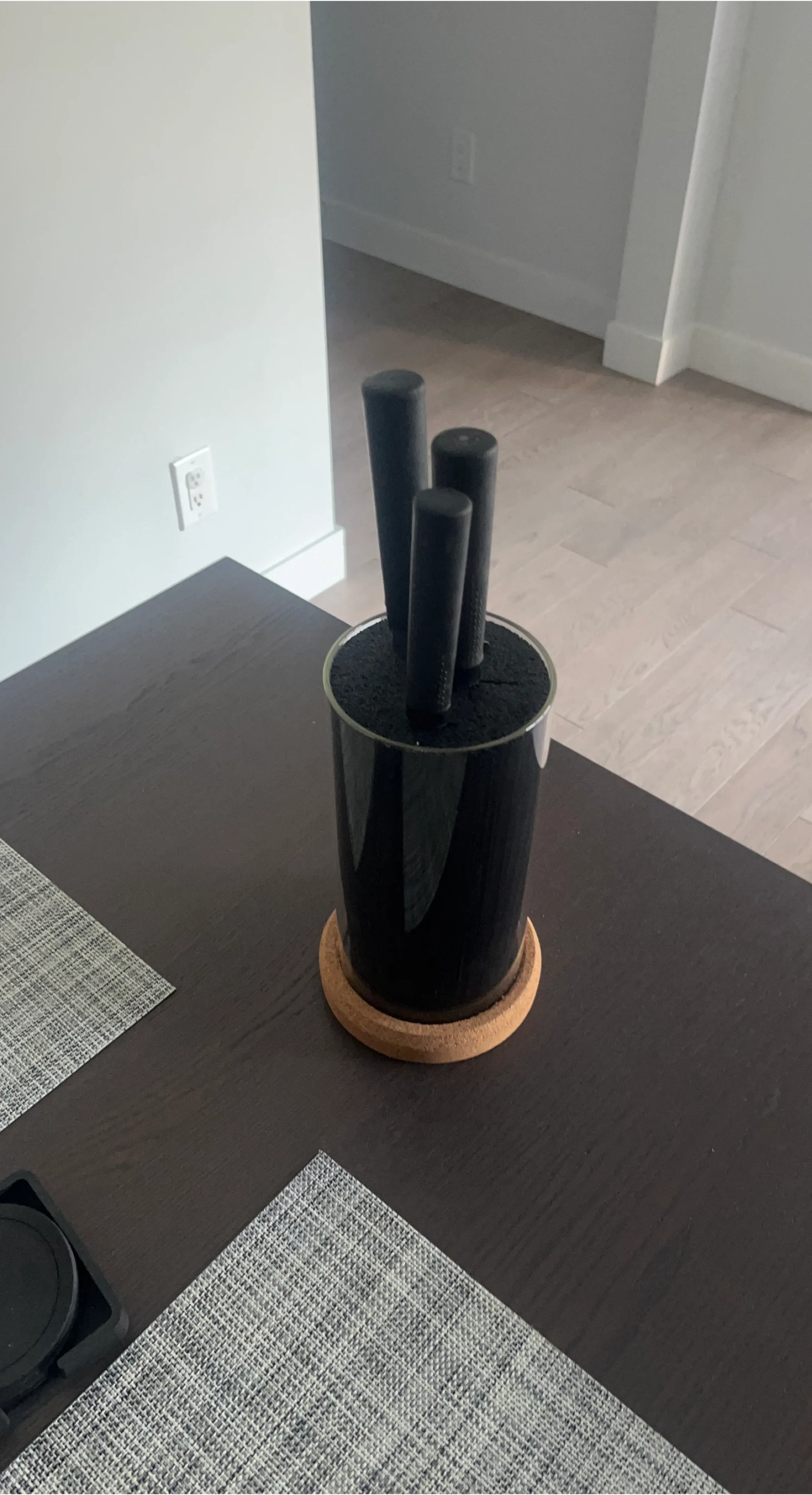 Clean IKEA knife set. Has 3 knives and a cool knife block. Block has flexible bristles inside, super easy to put knives away. Knives have black handles, blades are silver. Good for everyday cooking.
