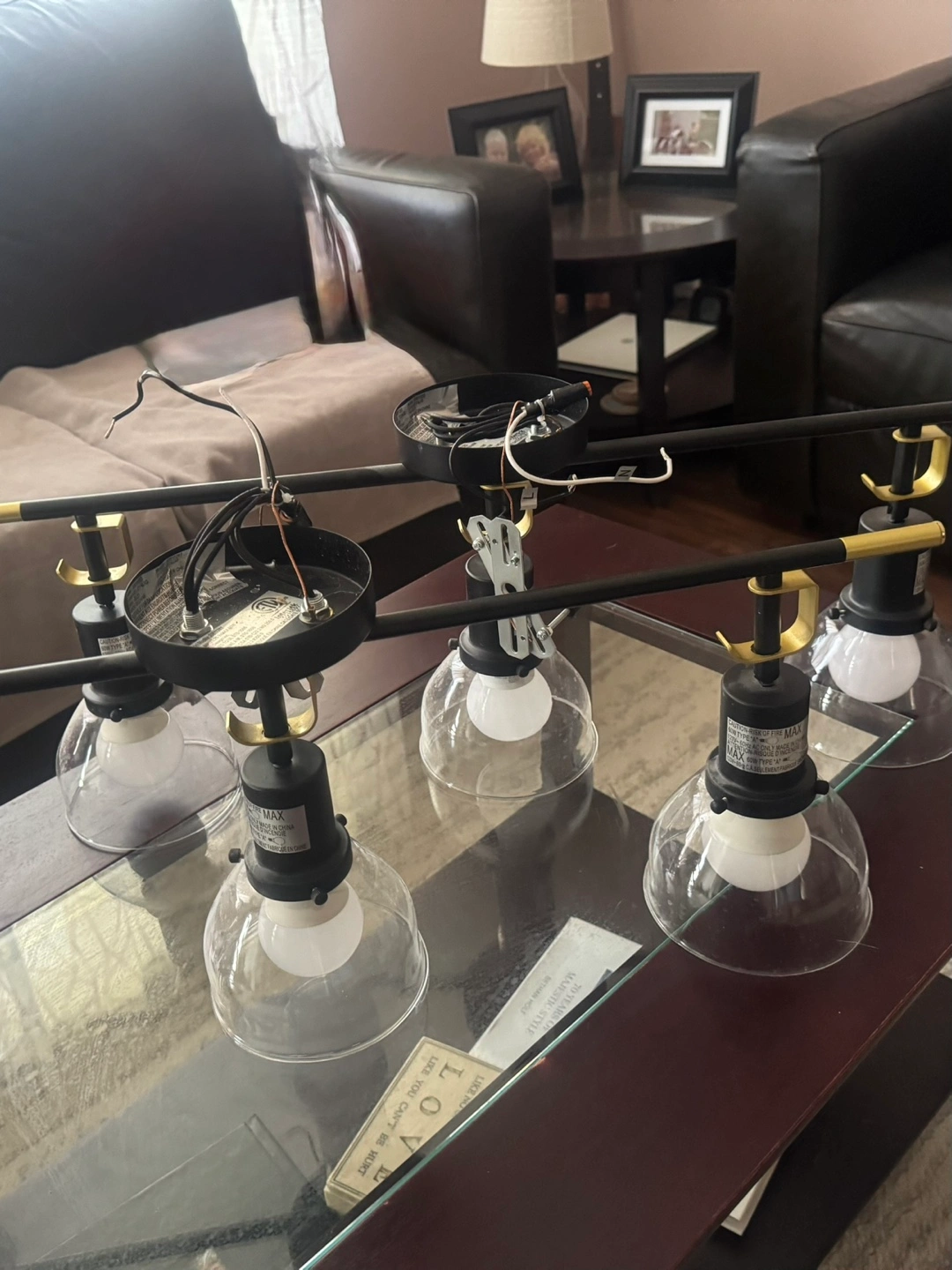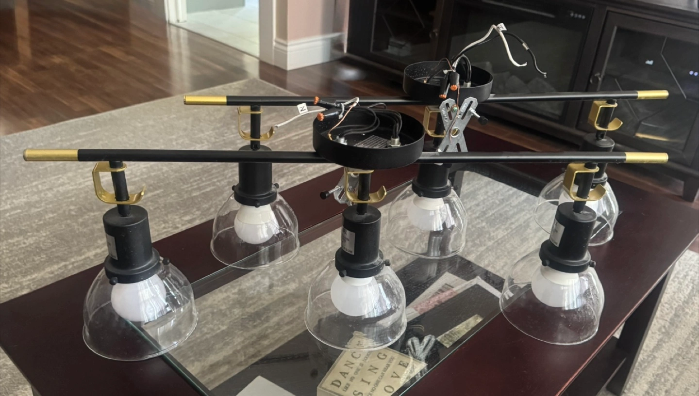 Selling a 2 stylish industrial-style light fixture! It features a matte black finish with gold accents, adding a modern touch to any room. Each fixture has 3 lights with clear glass shades, perfect for creating a warm and inviting atmosphere. It's in great condition and ready to brighten up your space!
