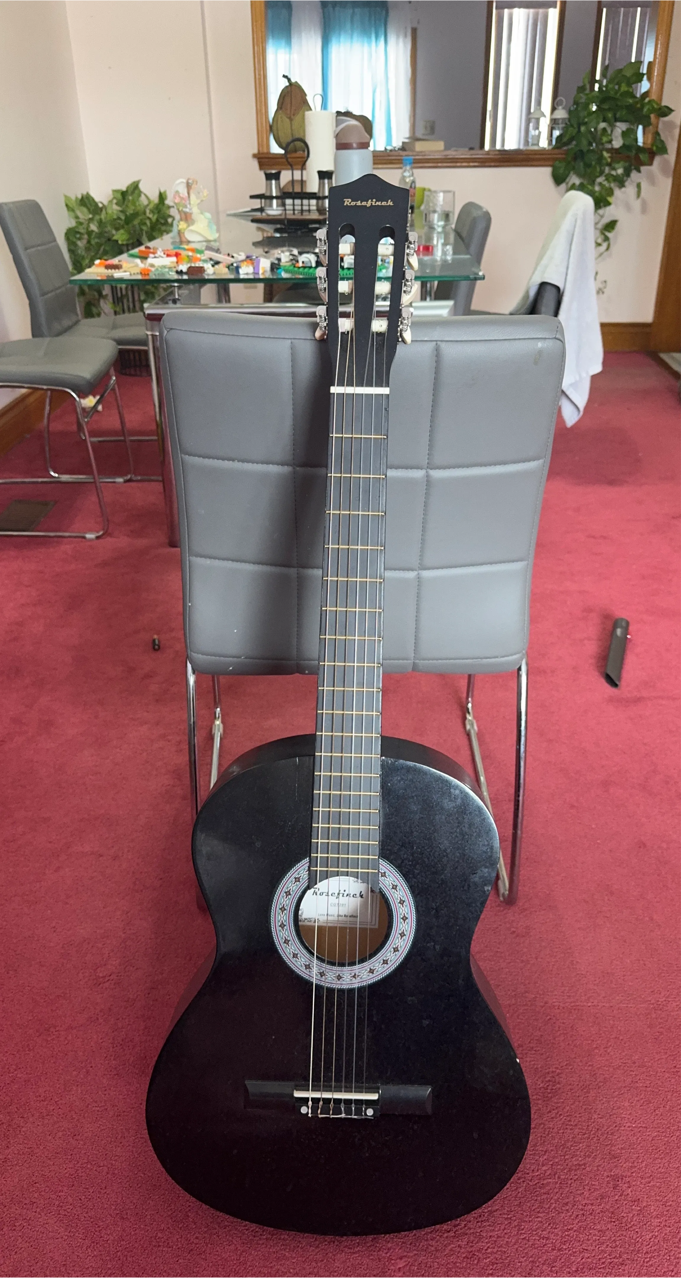 This is a black Rosefinch acoustic guitar. It's a nice instrument for learning or casual playing. It's made with a wood body and metal strings.