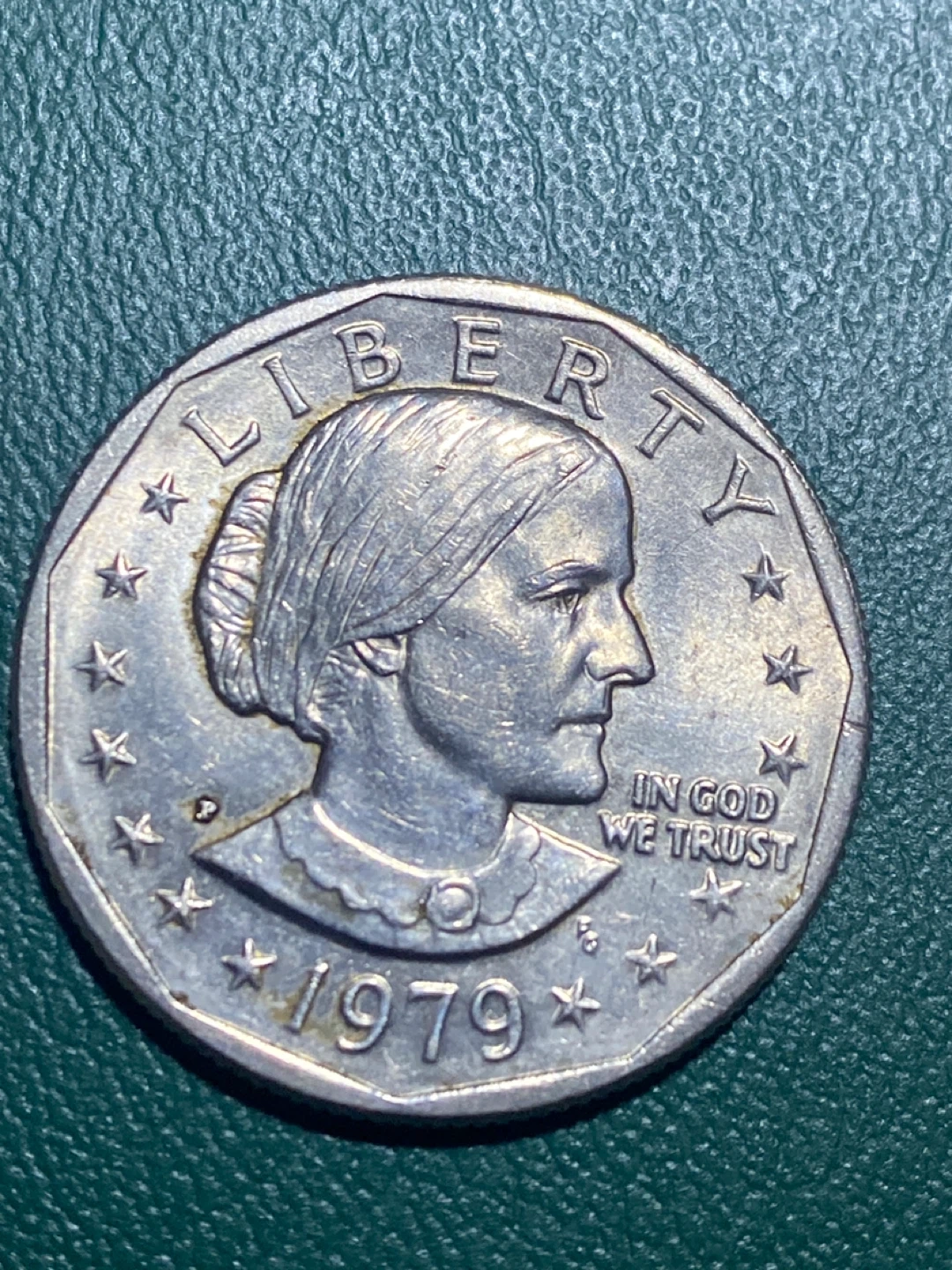 This is a 1979 Susan B. Anthony dollar coin. It's made of copper-nickel clad. The obverse features a profile of Susan B. Anthony. The reverse depicts an eagle landing on a branch. It's a one-dollar coin from the United States.