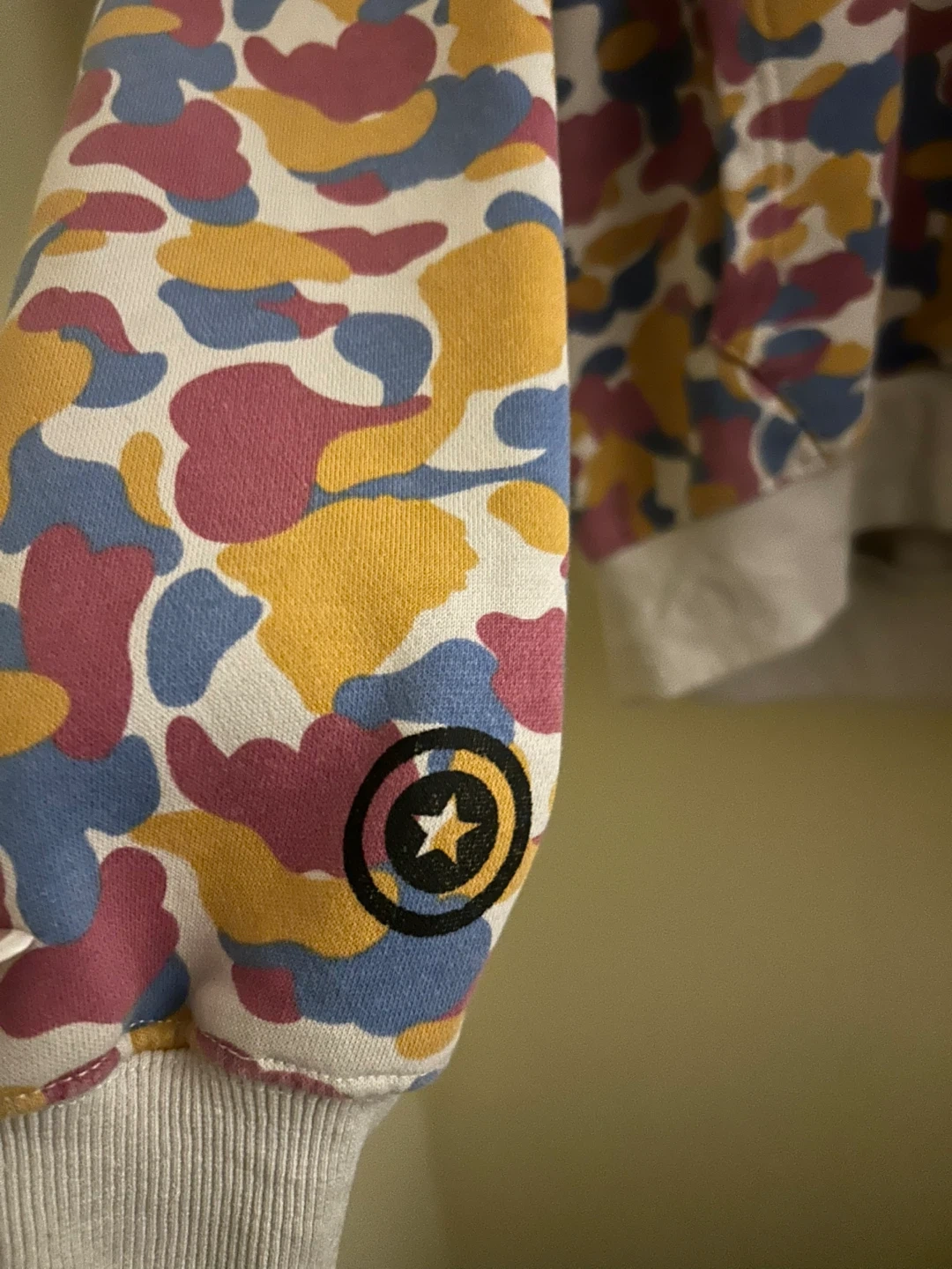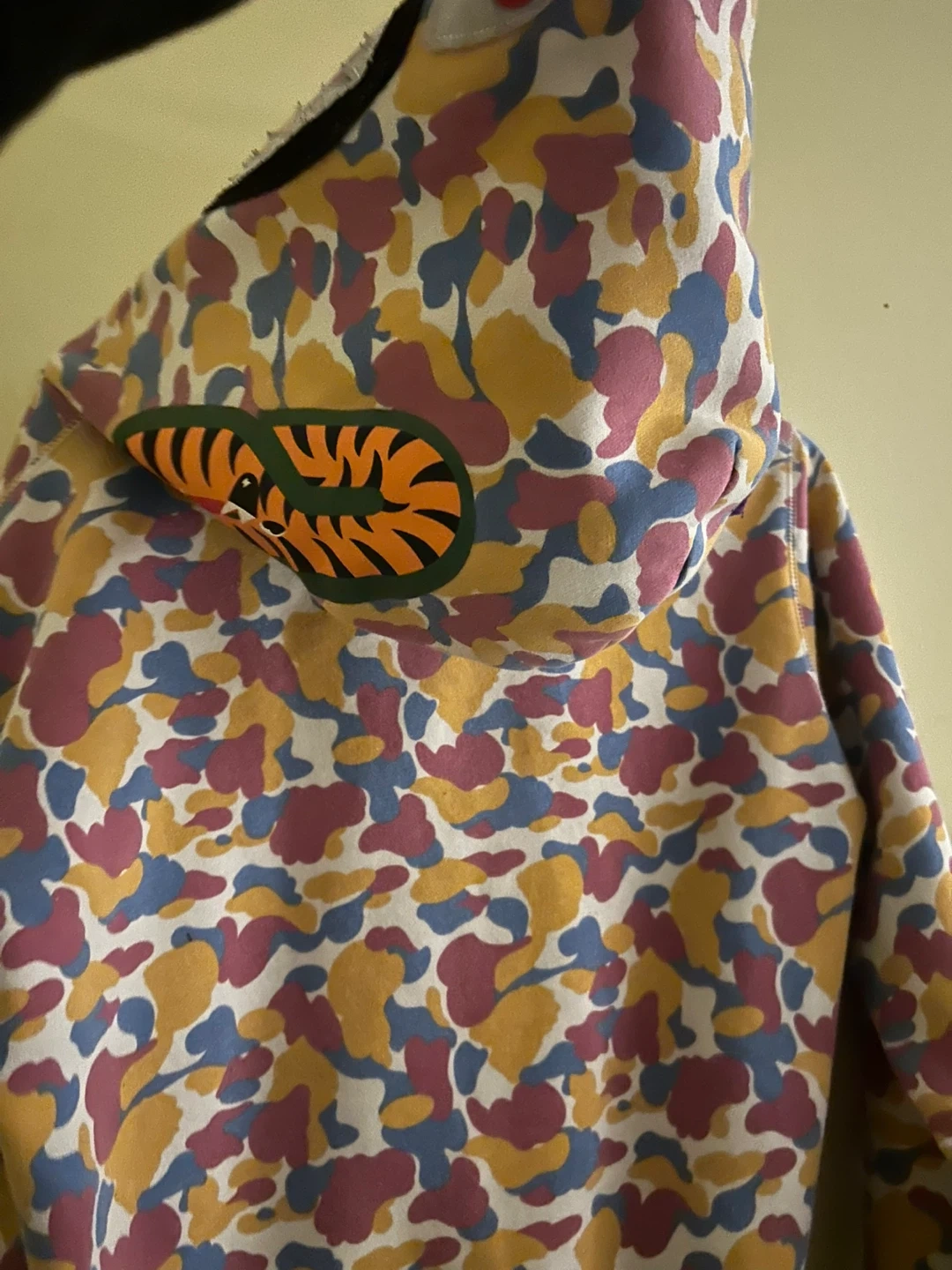 This BAPE hoodie features a colourful camo pattern. It has the signature BAPE shark graphic on the hood and a woven logo patch on the sleeve. Made from comfortable fabric.