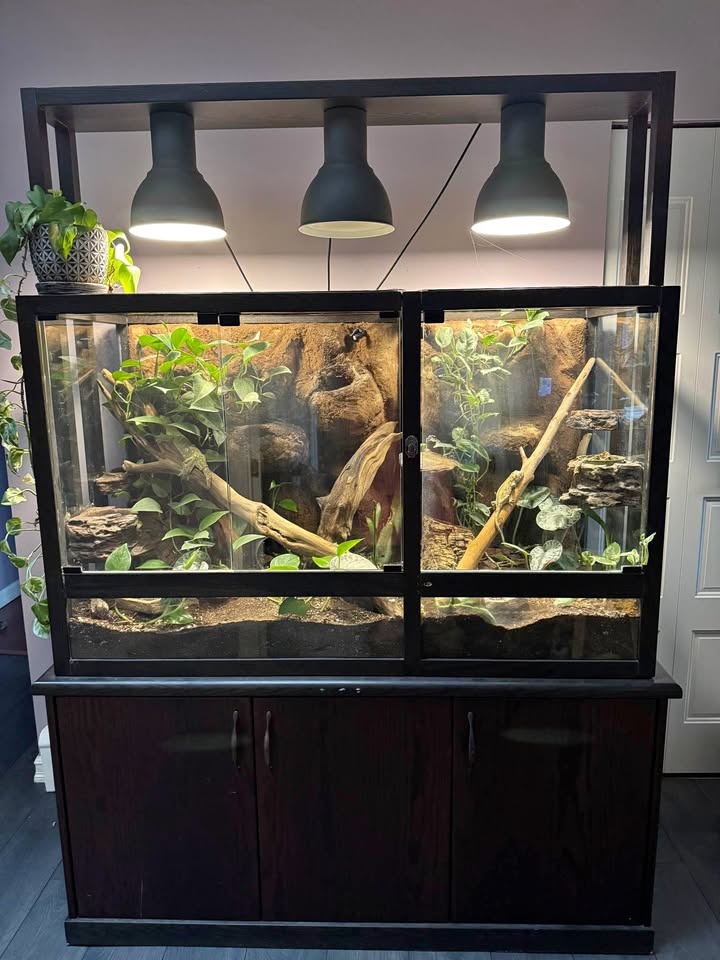 Selling a bioactive live reptile enclosure on wheels. It has a mist system installed and includes everything shown in the pictures. Dimensions are 57"x23"x78" (LxWxH).