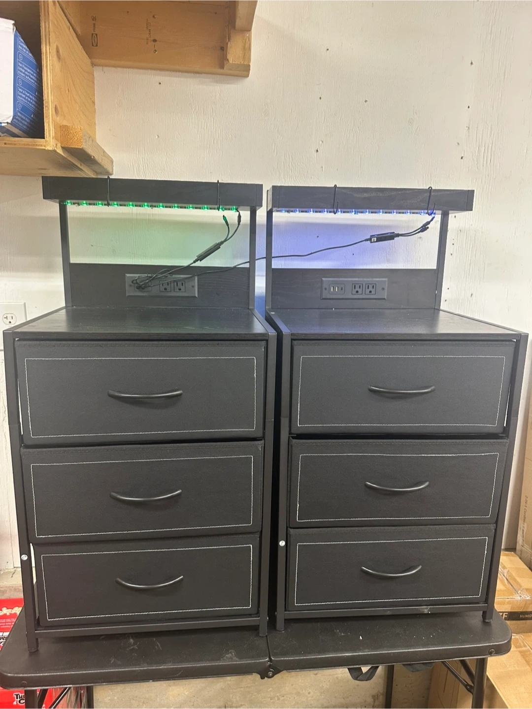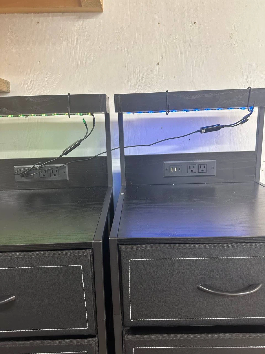 Selling a pair of black nightstands! They each feature a built-in LED light and USB ports, super convenient for charging your devices. Great for adding a modern touch to your bedroom. They have a sleek design and are in great condition!