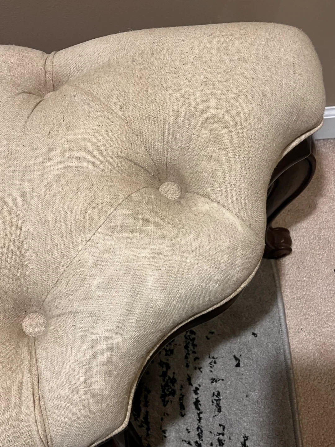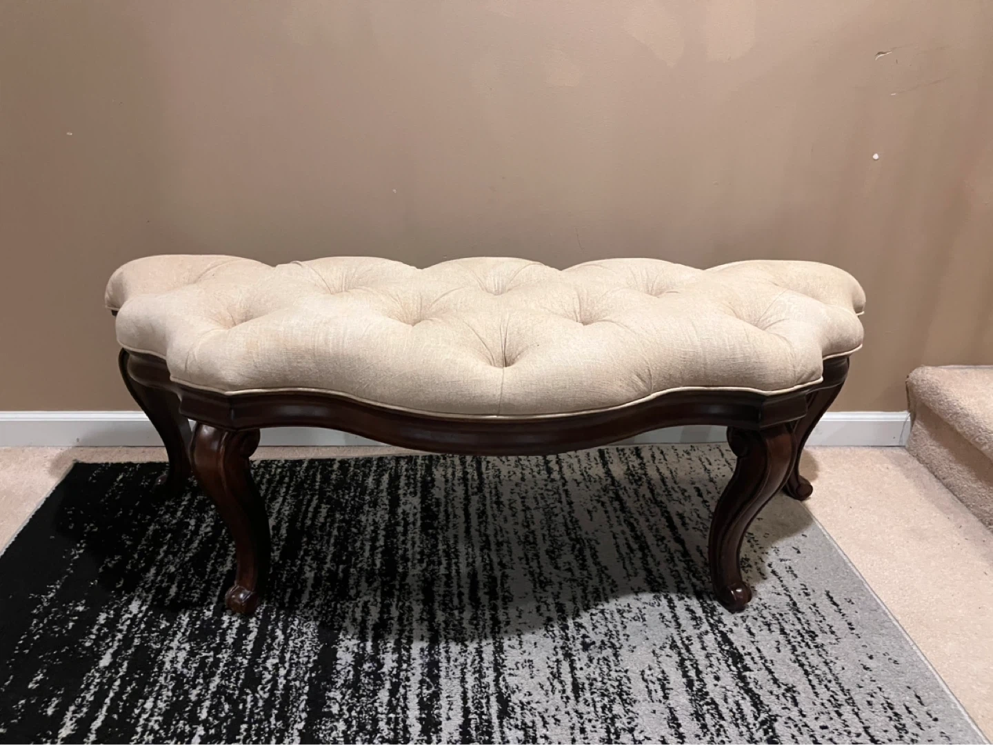 Vintage French style tufted bench with wood legs. Excellent quality. Great condition- only issue is a spot that is lighter on the fabric that cleaner bleached.