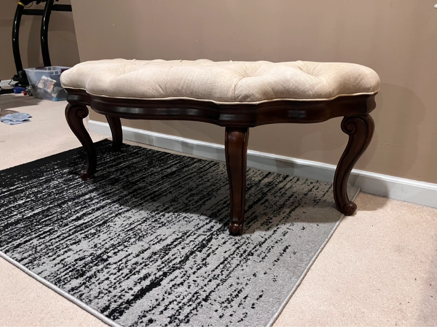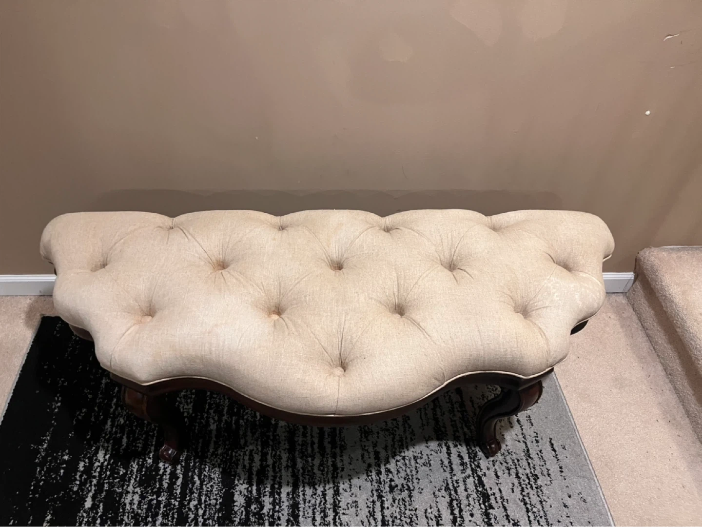 Vintage French style tufted bench with wood legs. Excellent quality. Great condition- only issue is a spot that is lighter on the fabric that cleaner bleached.