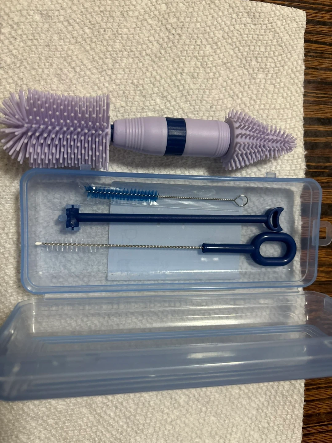 This set includes a silicone bottle brush with a pointed end for nipples. It also comes with three different sized straw brushes. All pieces store neatly in a clear blue case. Great for keeping baby bottles and straws clean!