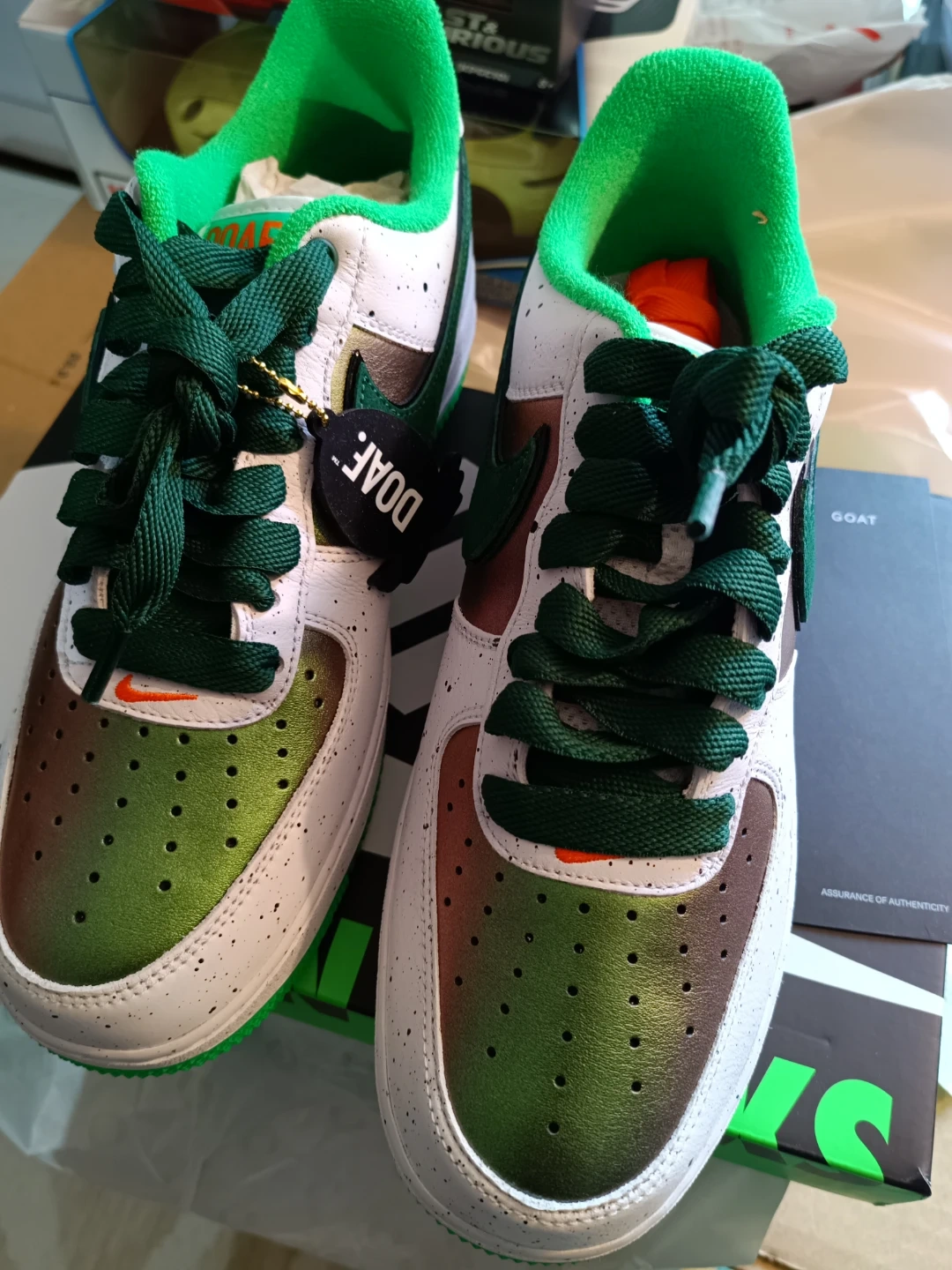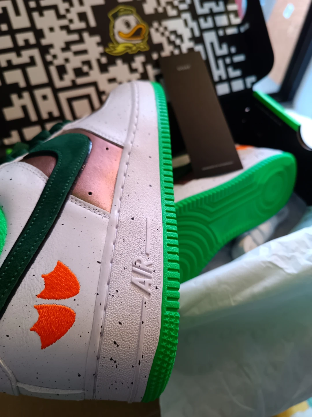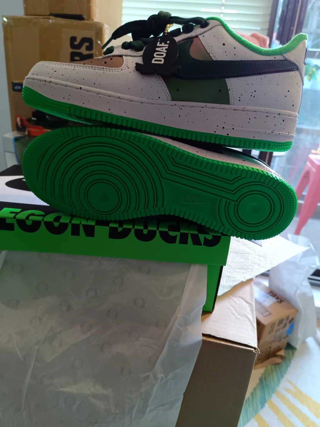 Selling a pair of Nike Air Force 1 Oregon Ducks shoes! They come with the box and are in great condition. The shoes feature a white, green, and brown colour scheme with "DUCK" and "EGG" printed on the heels. Perfect for any Oregon Ducks fan!