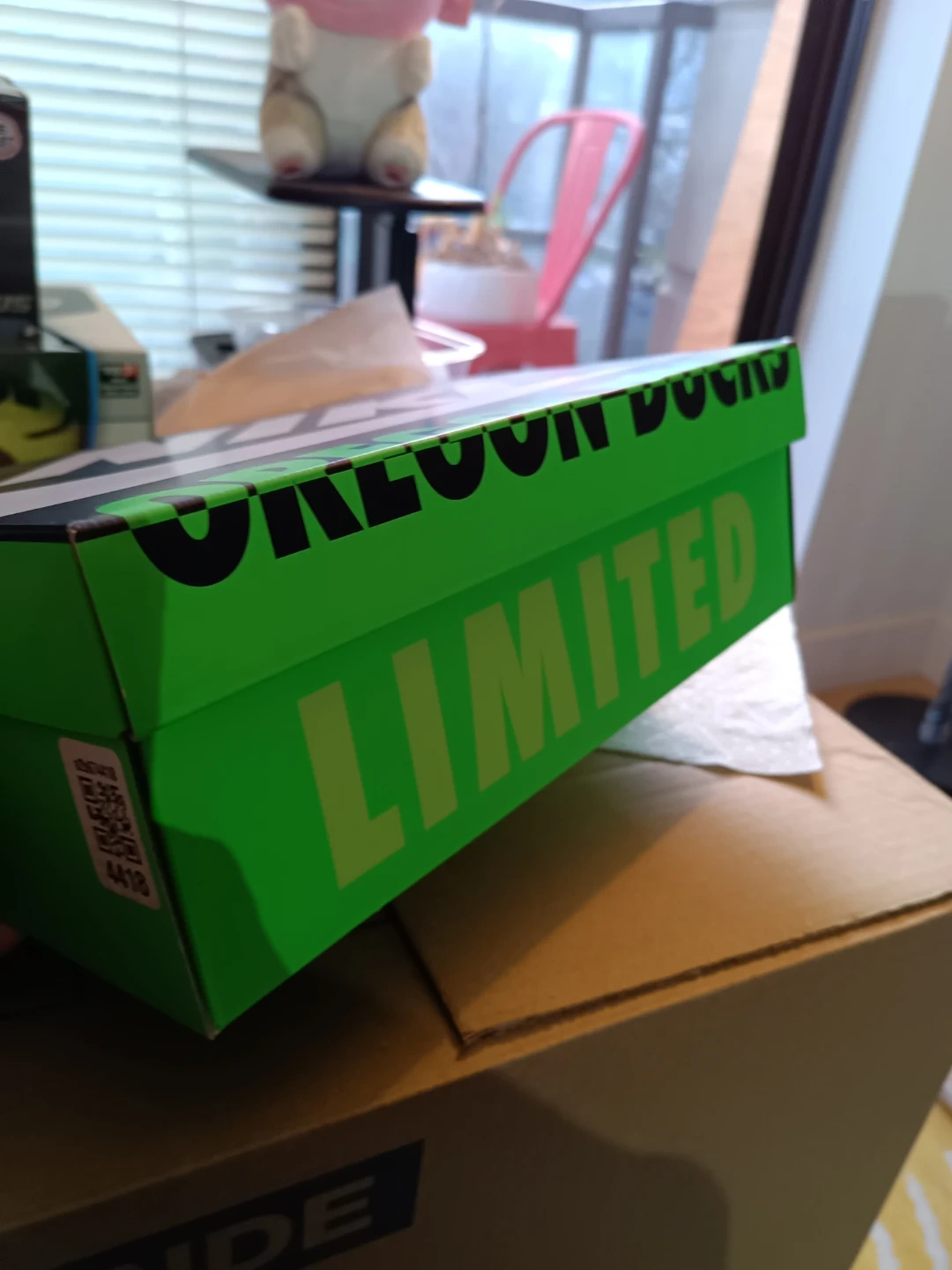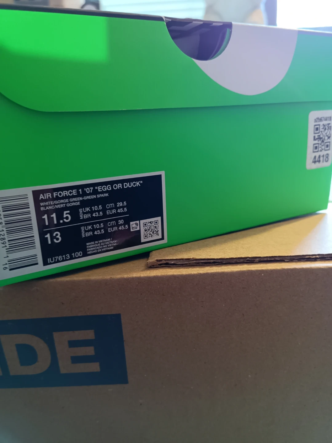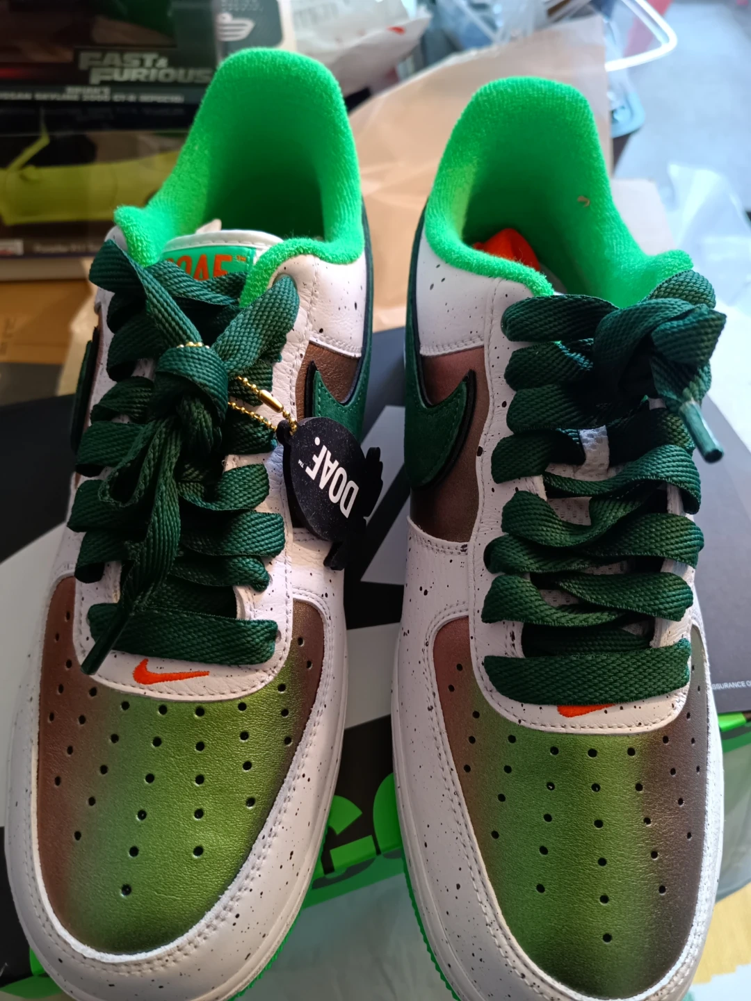 Selling a pair of Nike Air Force 1 Oregon Ducks shoes! They come with the box and are in great condition. The shoes feature a white, green, and brown colour scheme with "DUCK" and "EGG" printed on the heels. Perfect for any Oregon Ducks fan!