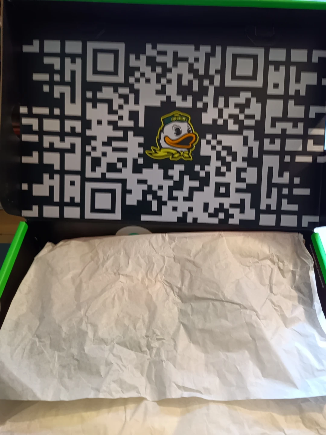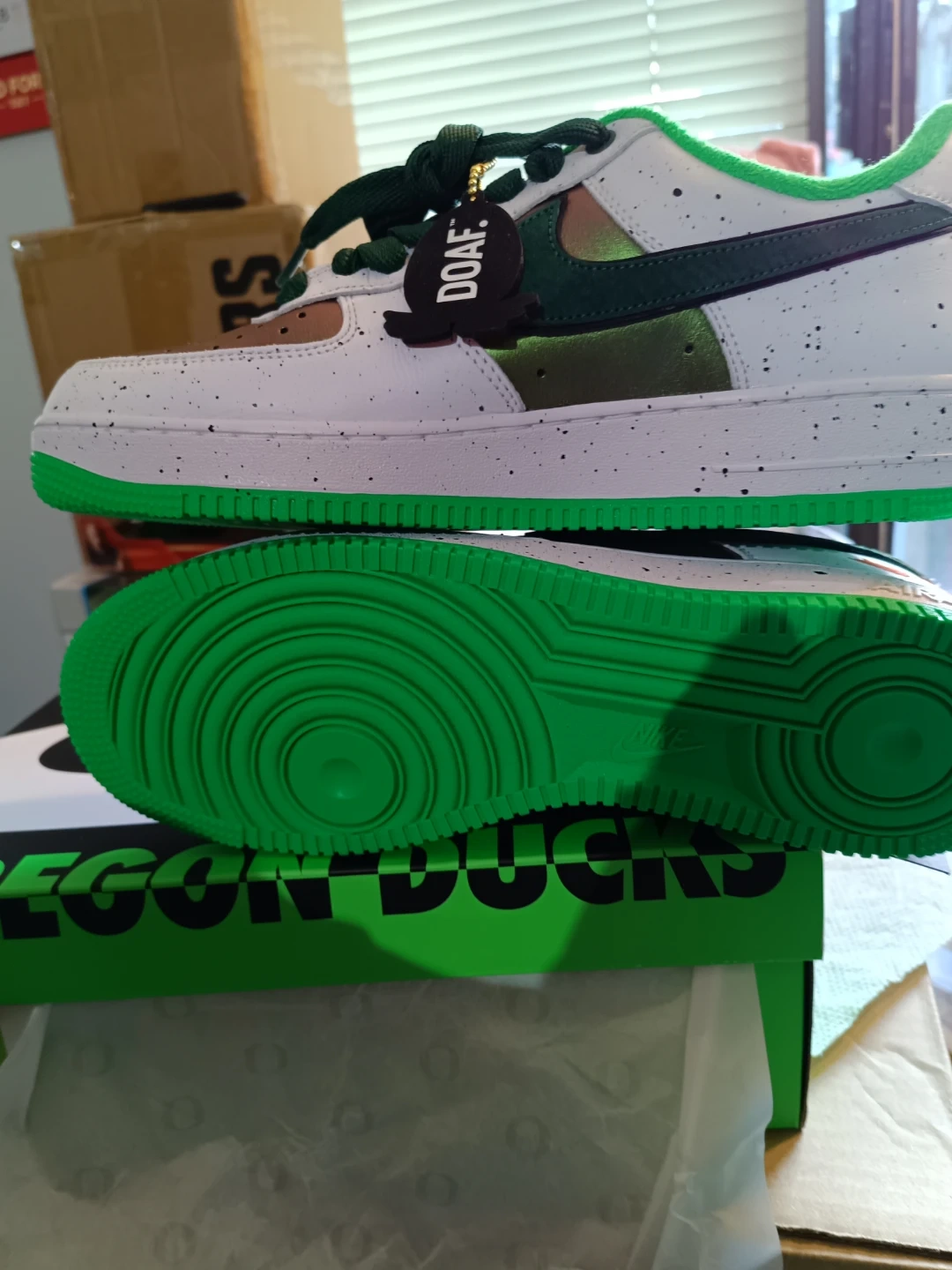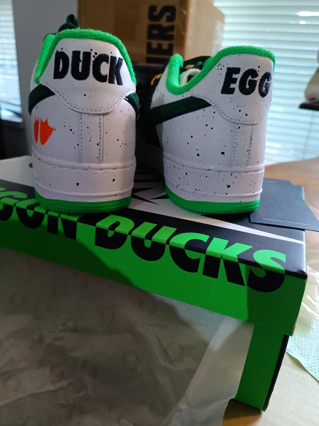 Selling a pair of Nike Air Force 1 Oregon Ducks shoes! They come with the box and are in great condition. The shoes feature a white, green, and brown colour scheme with "DUCK" and "EGG" printed on the heels. Perfect for any Oregon Ducks fan!