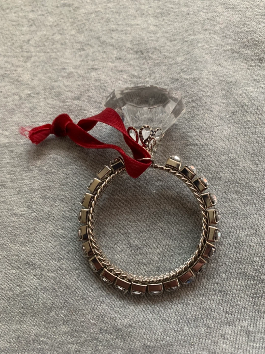 This festive ornament resembles a diamond ring. It features a clear faceted diamond top with a silver band adorned with small rhinestones. A red ribbon is attached for hanging.