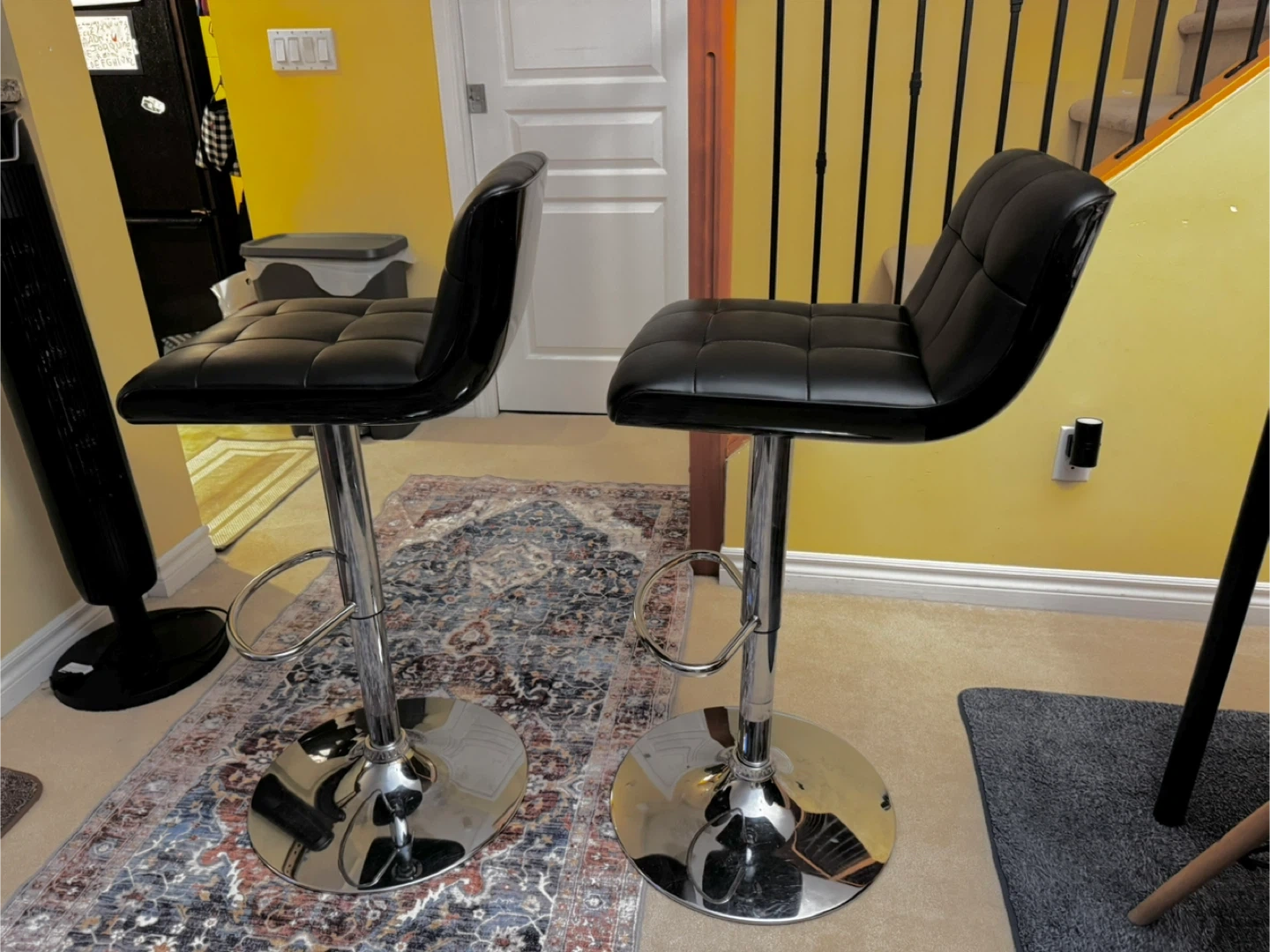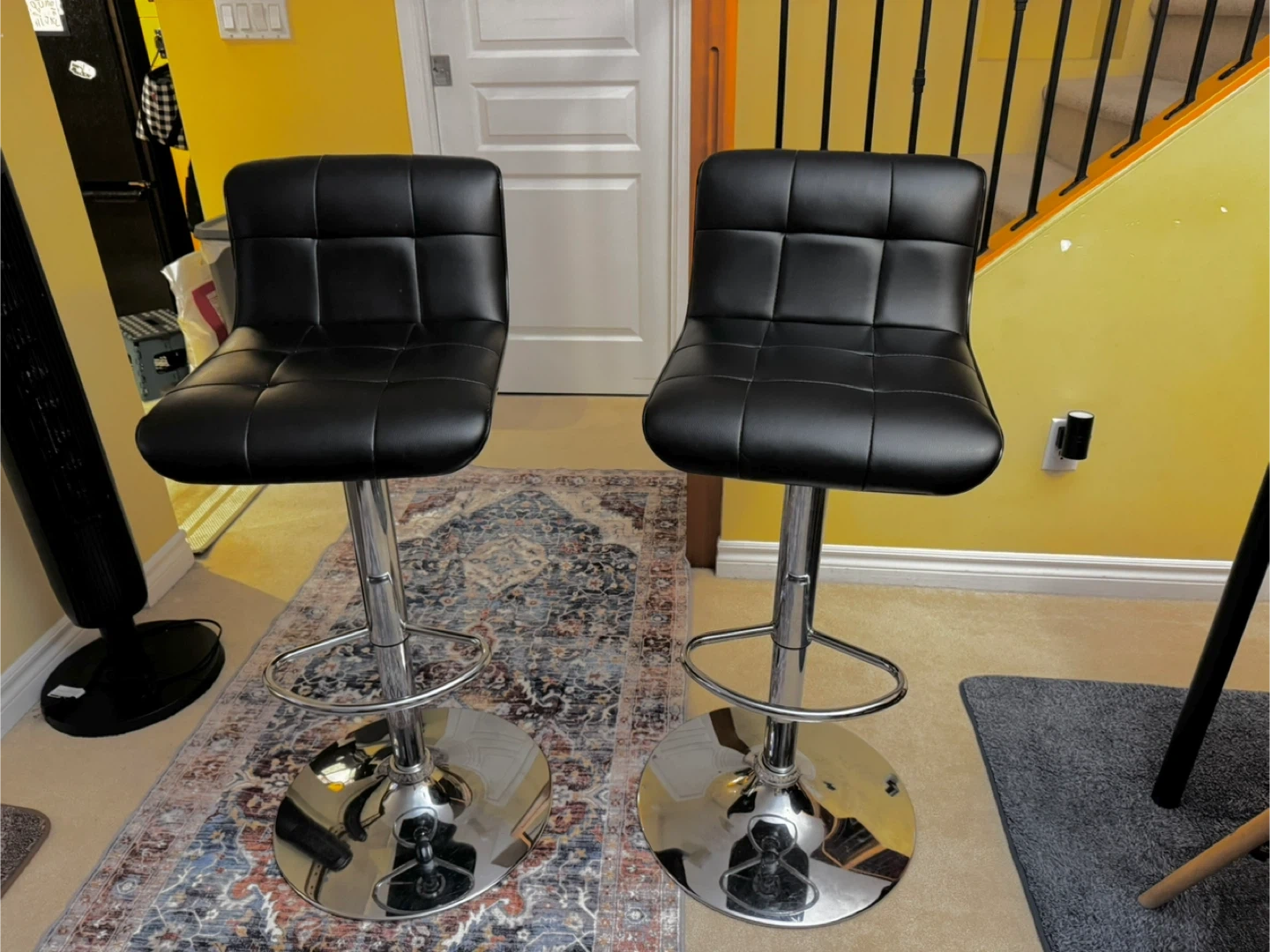 Two adjustable height bar stools with black faux leather seats and chrome bases. They've got a cushioned seat and back for comfort. These stools are great for a kitchen island or home bar.