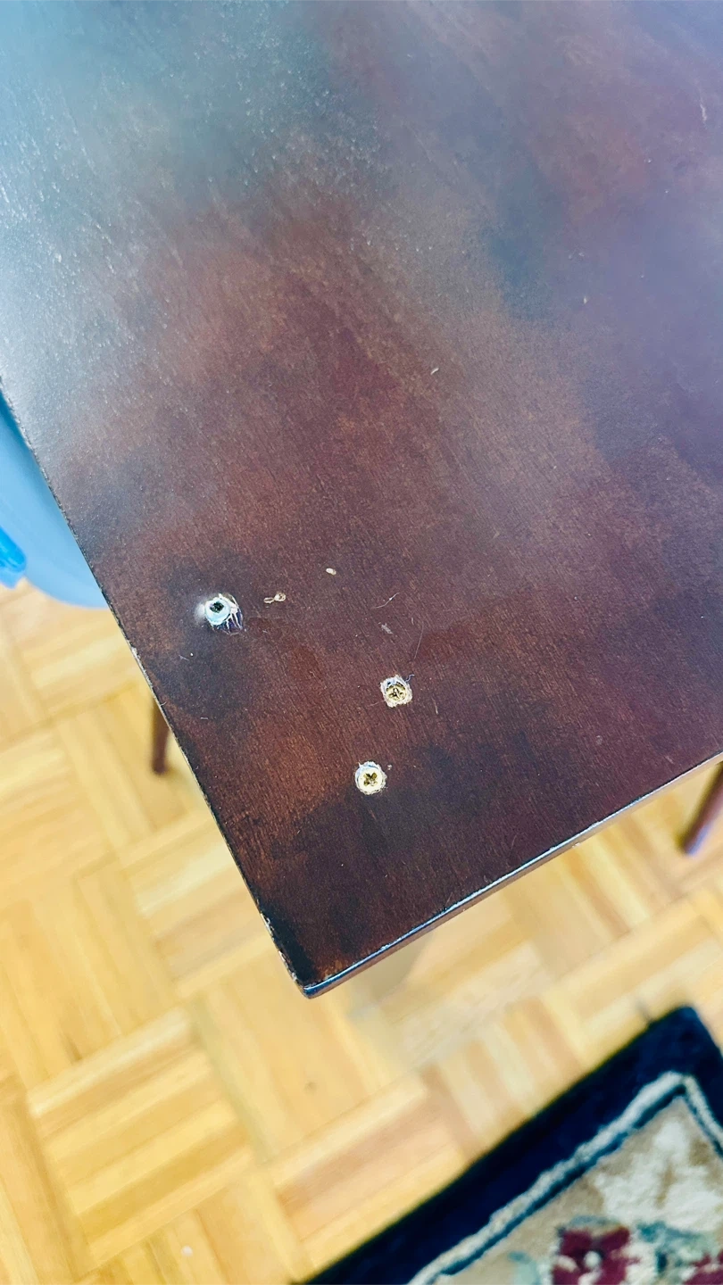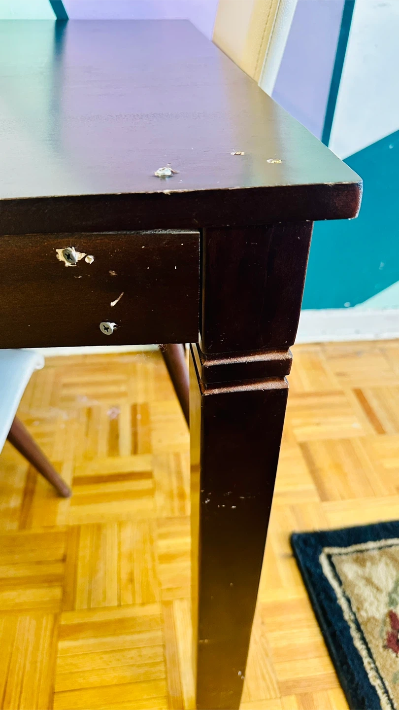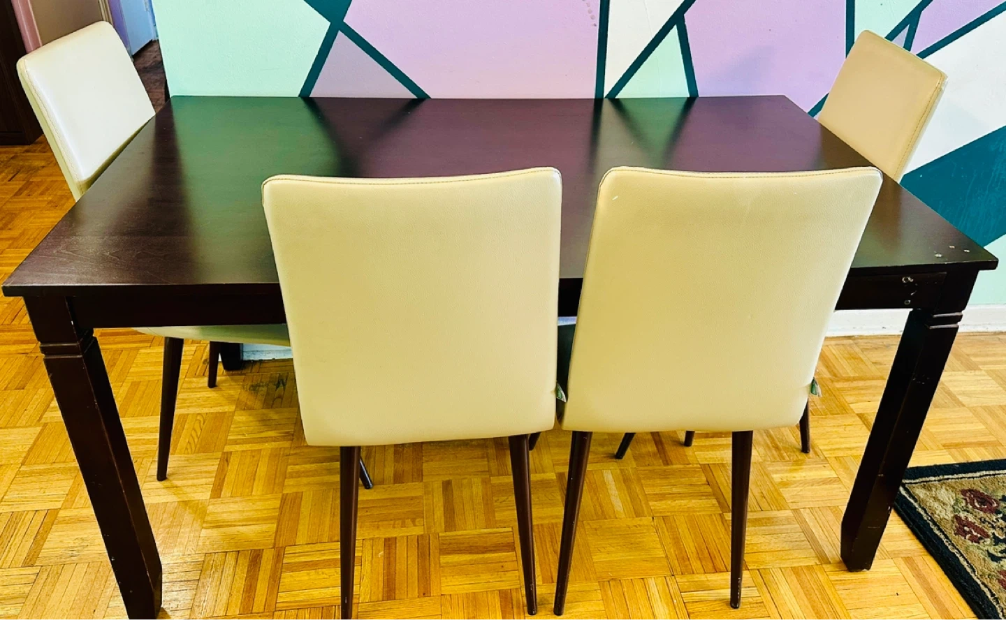 Selling a dining table with four chairs. The table is dark brown, and the chairs are beige. There are some signs of wear and tear on the table top and one leg but its fixed already, as shown in the pictures. But good working condition The chairs are in good condition.