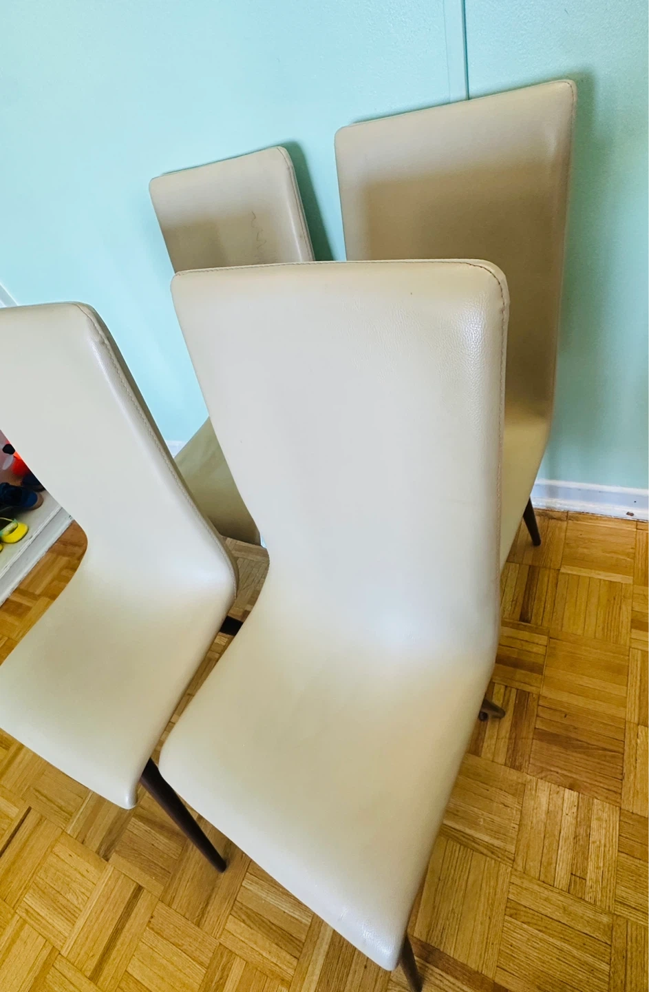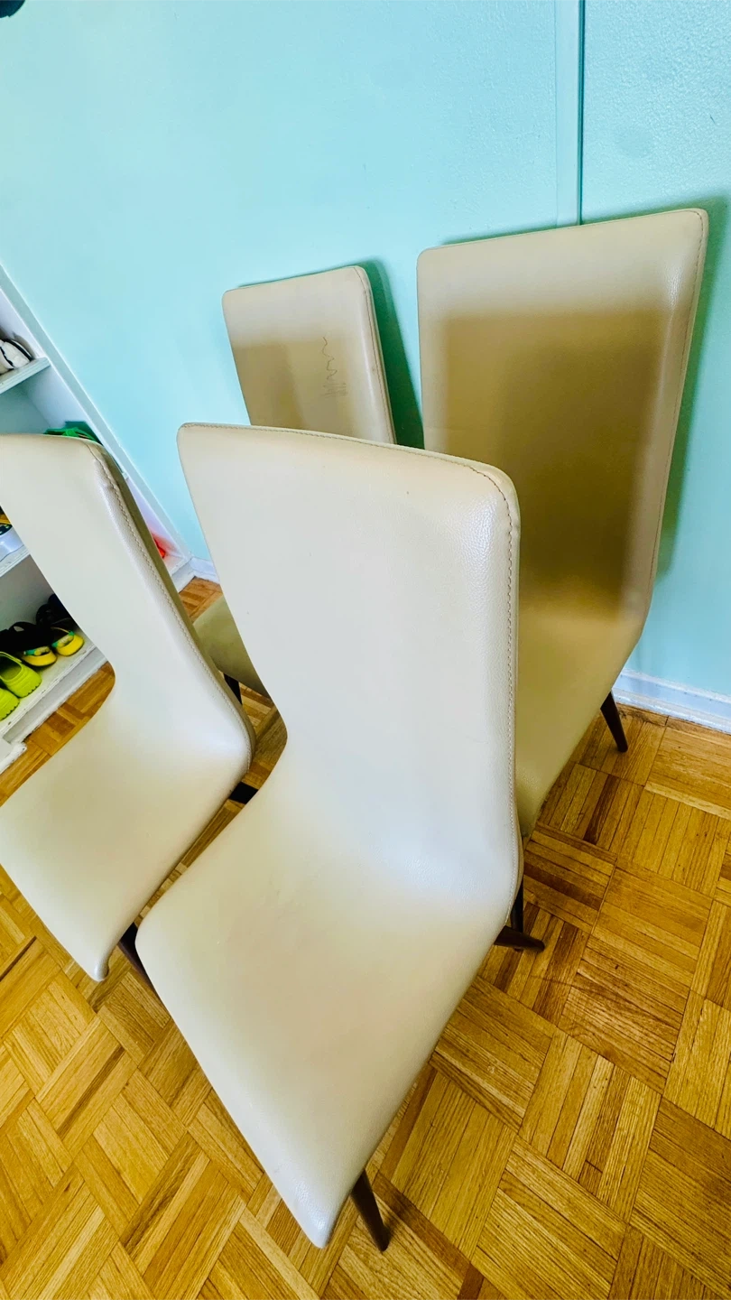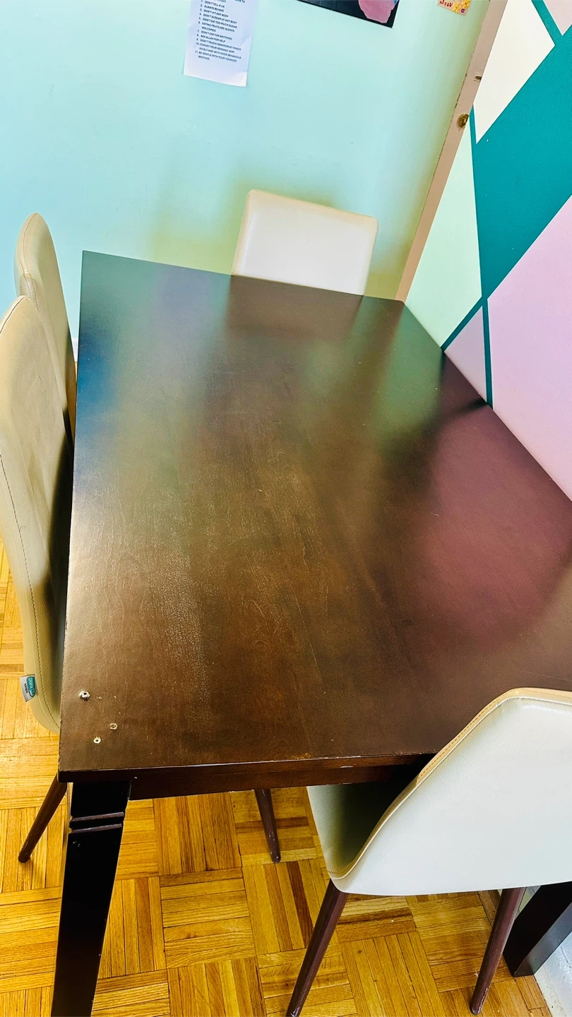 Selling a dining table with four chairs. The table is dark brown, and the chairs are beige. There are some signs of wear and tear on the table top and one leg but its fixed already, as shown in the pictures. But good working condition The chairs are in good condition.