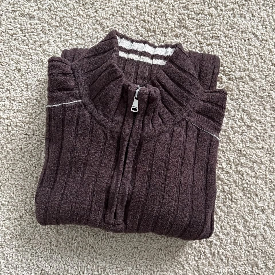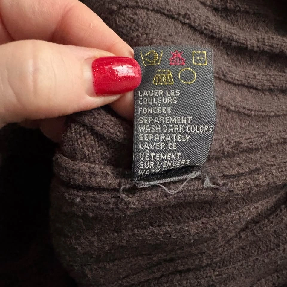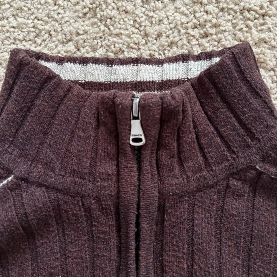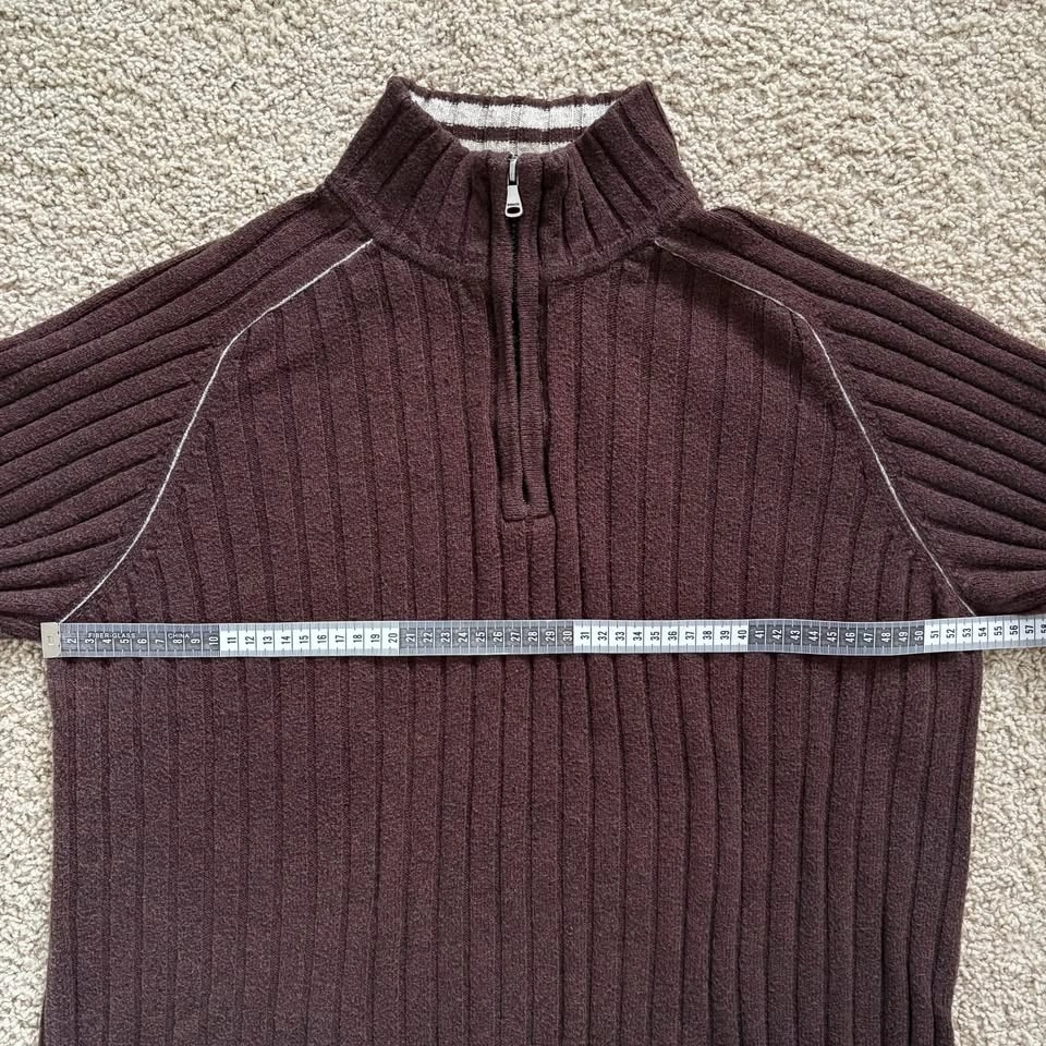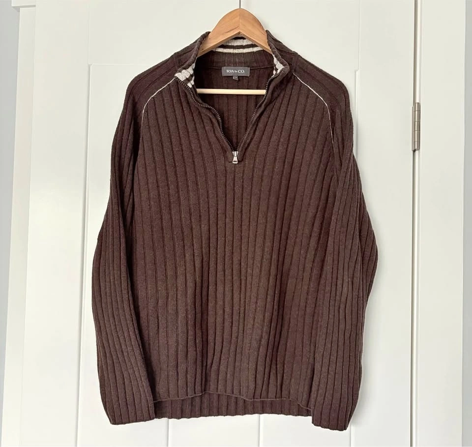 RW&Co. Neutral Chocolate Brown Ribbed Long Sleeve Sweater with Half Zip. Featuring a cozy and soft, stretchy fabric with a ribbed knit texture for added warmth and style. Good condition with general wear, particularly back of sleeves and some piling as shown. Men's Size Medium. 60% Cotton, 20% Lambswool, 20% Nylon. Measurements are approx.: Length 68cm, Pit to pit 54cm. Porch pick up west Maple Ridge.