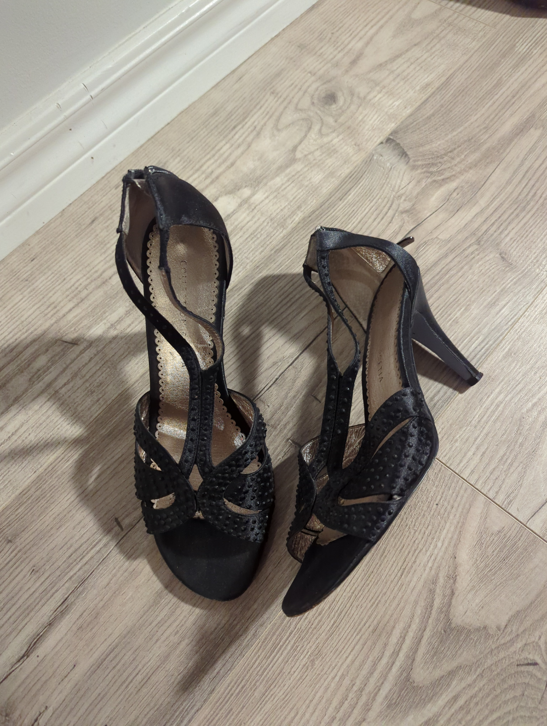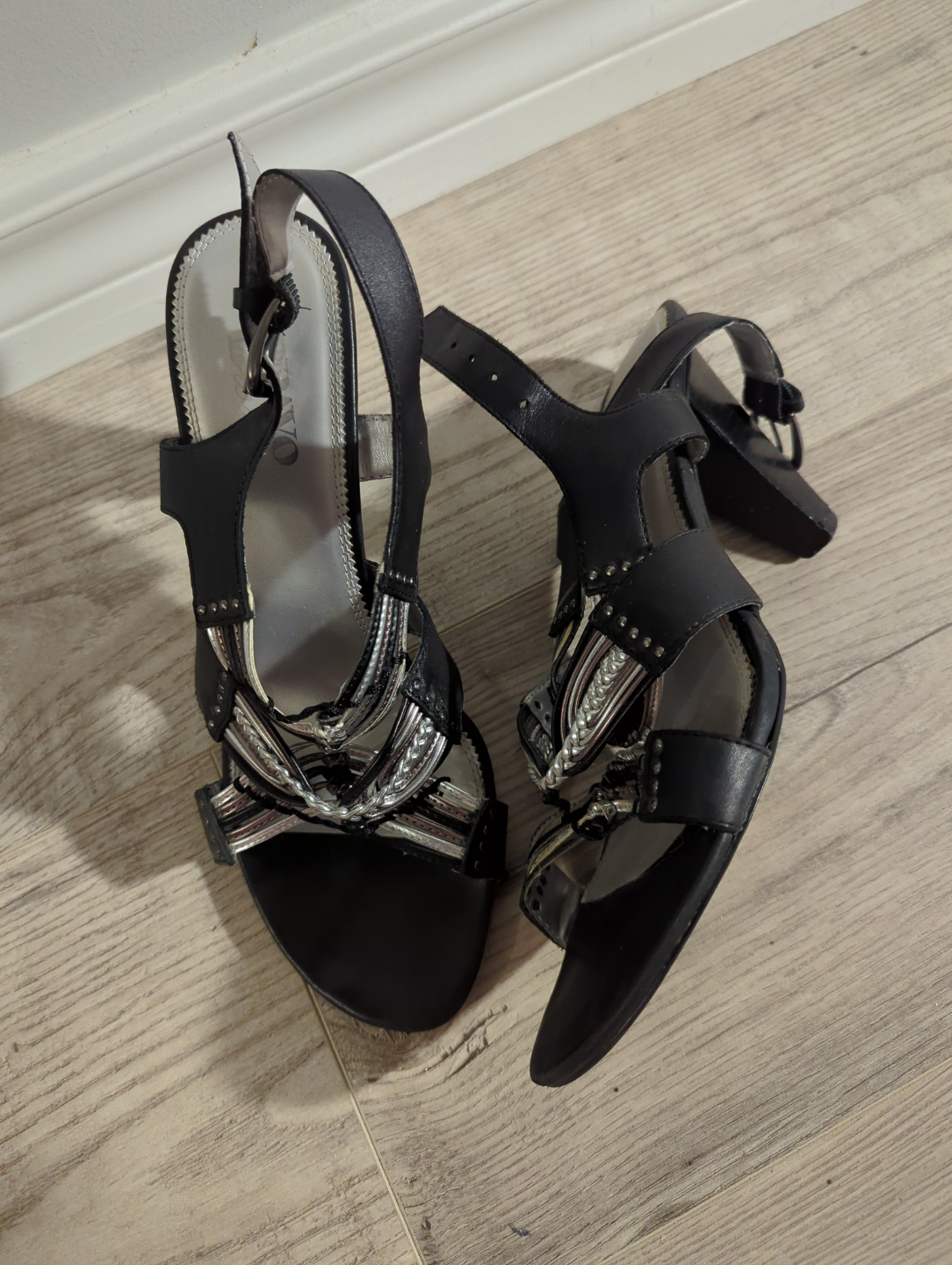 Women's heel. Include black suede mules size 9.5 (look new) $15, black peep-toe heels size 9.5 $5, black sandals with silver accents size 9.5 $5 and black satin T-strap heels size 9. $8. Various heel heights and styles. Great for various occasions.