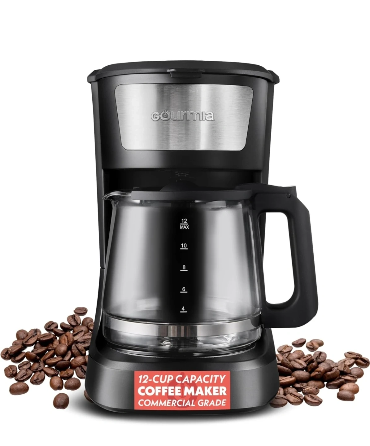 Get ready to brew some delicious coffee with this Gourmia coffee maker! It has a 12-cup capacity and is commercial grade. It also has an easy-clean warming plate and removable filter basket. The durable glass carafe has easy-to-read measurements to prevent guesswork. It's in like-new condition and ready for your kitchen!