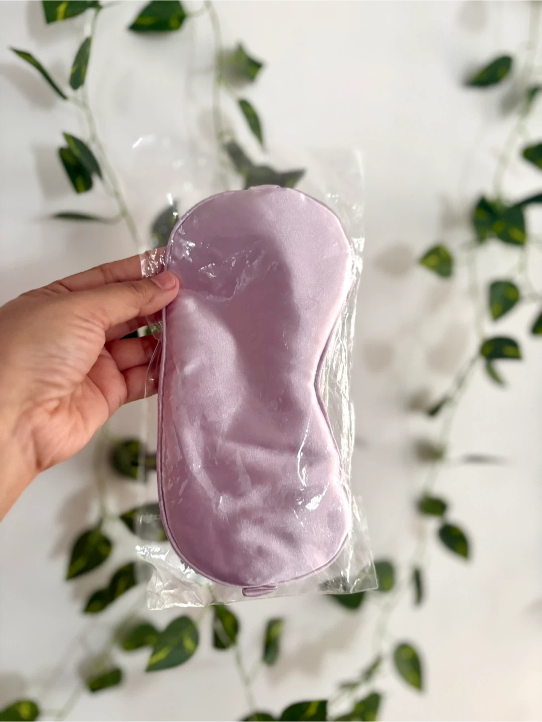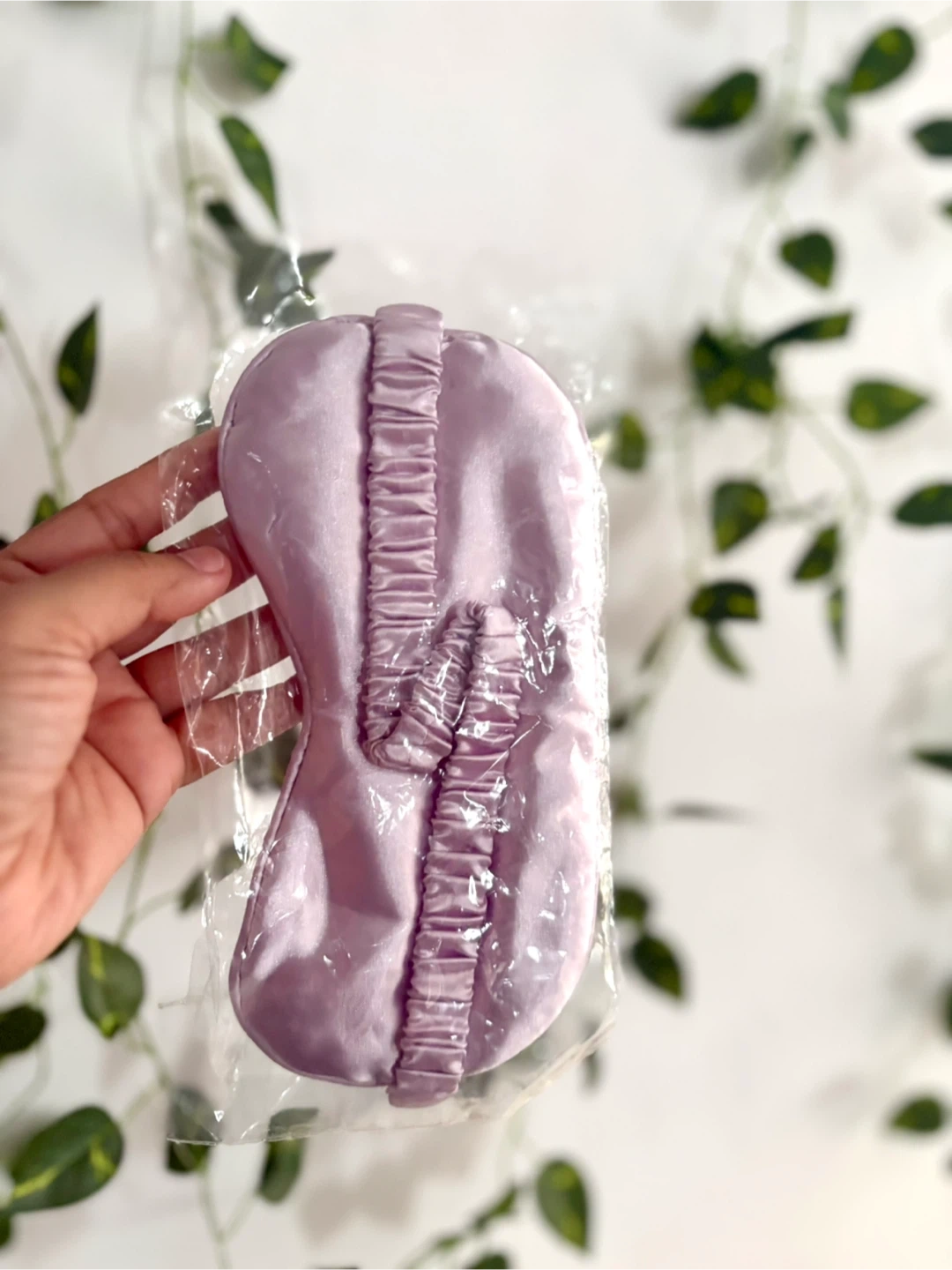 This sleep mask is made of soft lilac satin. It has an elastic strap for a comfortable fit. Great for blocking out light and getting a good rest!