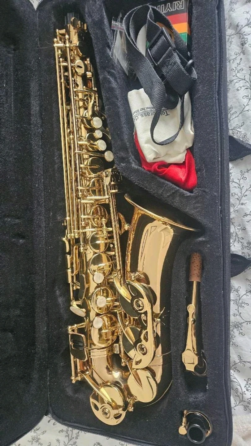 saxophone in a black carrying case. It's gold-toned brass with white keys. Includes a neck strap and cleaning cloth. Ready for practice!