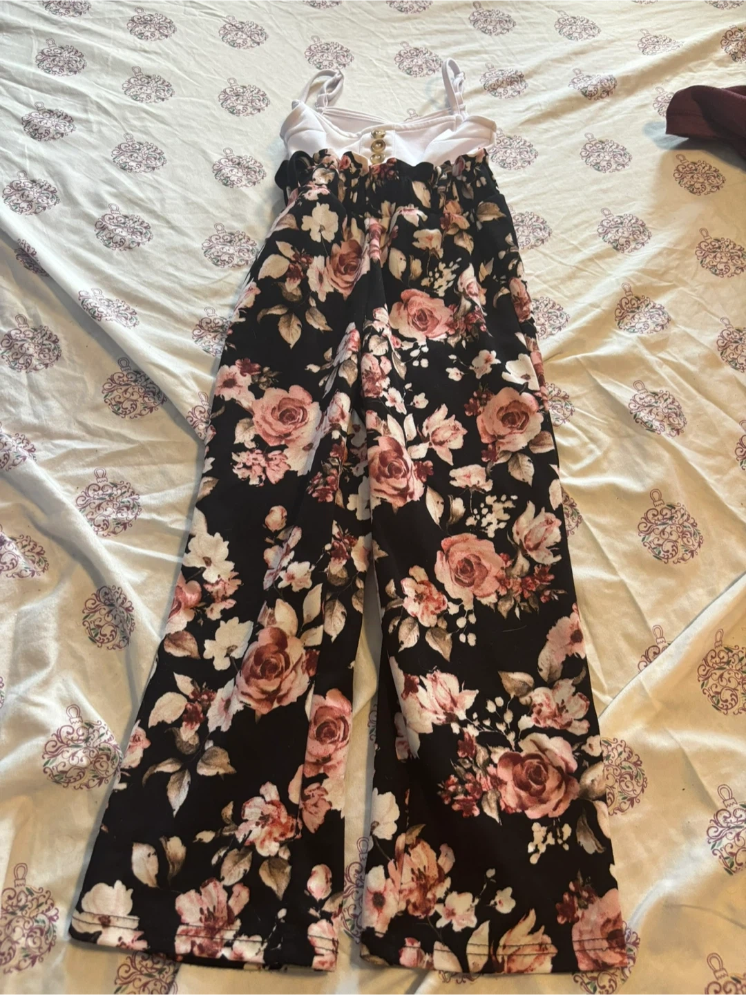 Cute UKIDS jumpsuit in size XXS! It features a fun floral pattern on the pants and has a white top. Perfect for a kid!